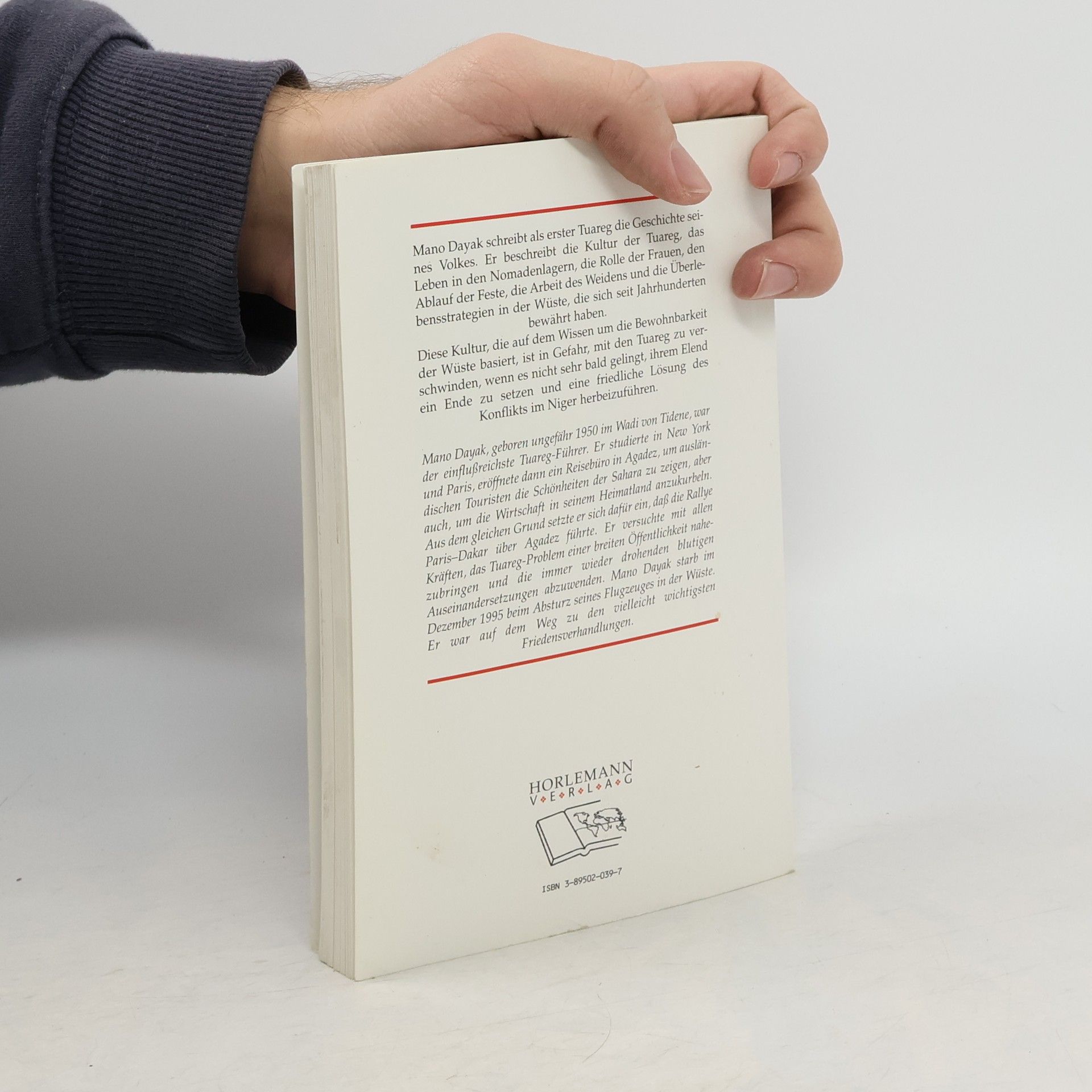 Mano Dayak schreibt als erster Tuareg die Geschichte seines Volkes. Er beschreibt die Kultur der Tuareg, das Leben in den Nomadenlagern, die Rolle der Frauen, den Ablauf der Feste, die Arbeit des Weidens und die Überlebensstrategien in der Wüste, die sich seit Jahrhunderten bewährt haben. Diese Kultur ist in Gefahr, wenn es nicht gelingt, eine friedliche Lösung des Konflikts im Niger herbeizuführen. (Quelle: Katalog SBE).