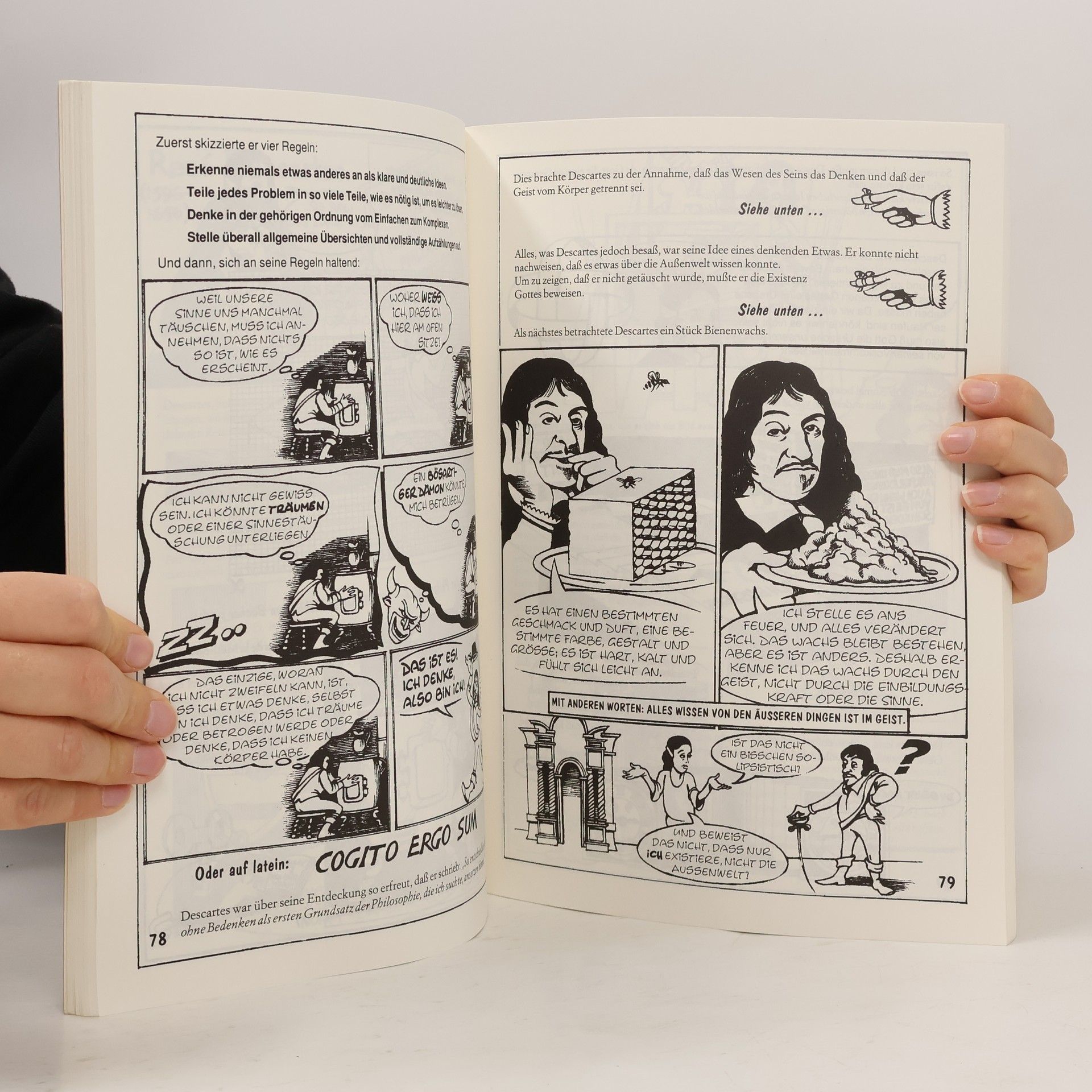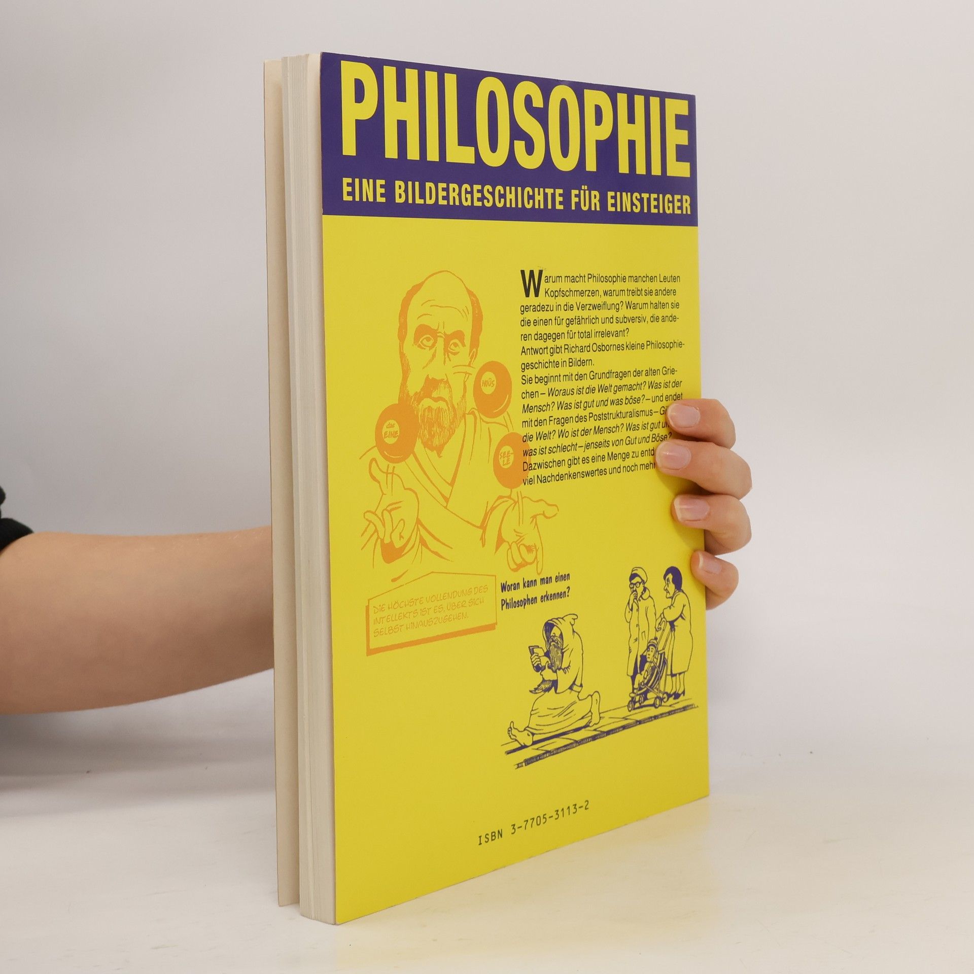 Warum macht Philosophie machen Leuten Kopfschmerzen, warum treibt sie andere geradezu in die Verzweiflung? Warum halten Sie die einen für gefährlich und subversiv, die anderen dagegen für total irrelevant?< Antwort gibt Richard Osbornes kleine Philisophiegeschichte in Bildern. Sie beginnt mit den Grundfragen der alten Griechen - Woraus ist die Welt gemacht? Was ist der Mensch? Was ist gut und was Böse? – und endet mit den Fragen der Poststuktutralismus – Gibt es die Welt? Wo ist der Mensch? Was ist gut und was ist schlecht – jenseits von Gute und Böse? Dazwischen gibt es eine Menge zu entdecken, viel Nachdenkenswertes und noch mehr Spaß.