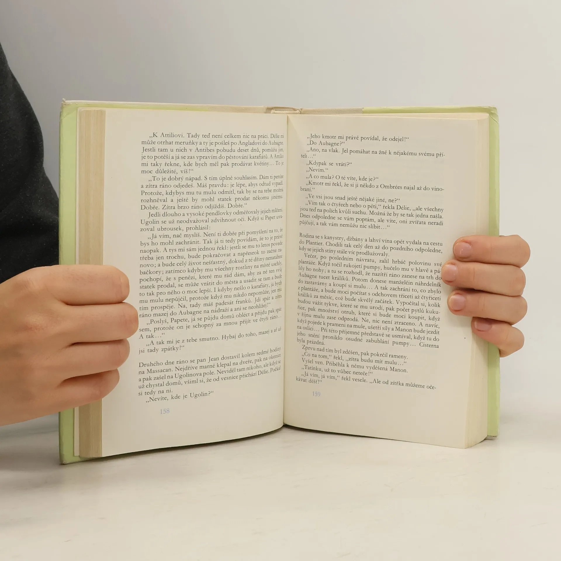 Román z francouzského venkova. Příběh hrbatého berního úředníka, operní zpěvačky a jejich dcerky Manon, kteří se ujmou pochybného dědictví - osamělé usedlosti v horách - dojímá úpornou snahou nezkušených měšťáků zvelebit půdu svých předků a živit se na ni prací vlastních rukou. Marné úsilí pana Jeana nezápasí pouze s nepřízní přírody ale především s lidskou hloupostí a zlobou. Toto drama založené na zločinu a trestu má sílu antické tragedie, jejímiž protagonisty jsou vedle lidí i slepé síly Osudu. Leč nechybí v něm ani katarze, k níž dá podnět nečekané odhalení na konci knihy. Její závěr je ve znamení smíru a naděje.