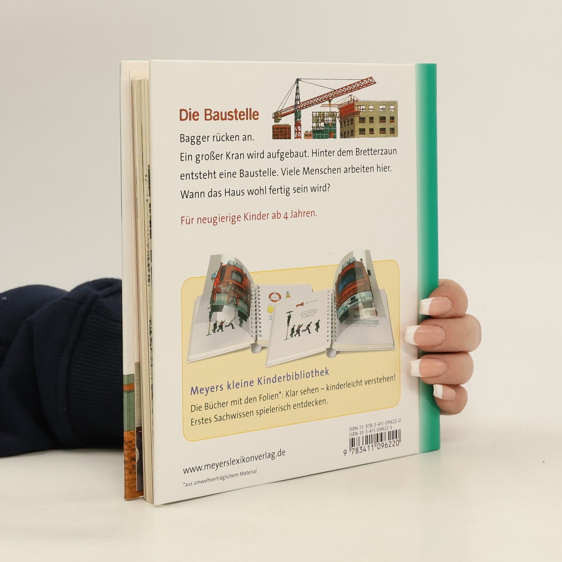 Durch spannende Effekte vermittelt die Bilderbuchreihe „Meyers kleine Kinderbibliothek“ erstes Sachwissen für Kinder ab 3 Jahren. Transparente Folien zeigen beim Umblättern das Innenleben von Dingen, machen Verdecktes sichtbar oder veranschaulichen Veränderungen. In diesem Band lernen die Kleinsten spielerisch, welche Bauarbeiten mit dem Ladebagger, dem Löffelbagger oder dem Mischfahrzeug erledigt werden. Außerdem erfahren sie, wie Beton gemischt wird, wozu man einen Turmdrehkran benötigt oder welche Aufgabe der Architekt, der Bauleiter und der Vermesser haben.