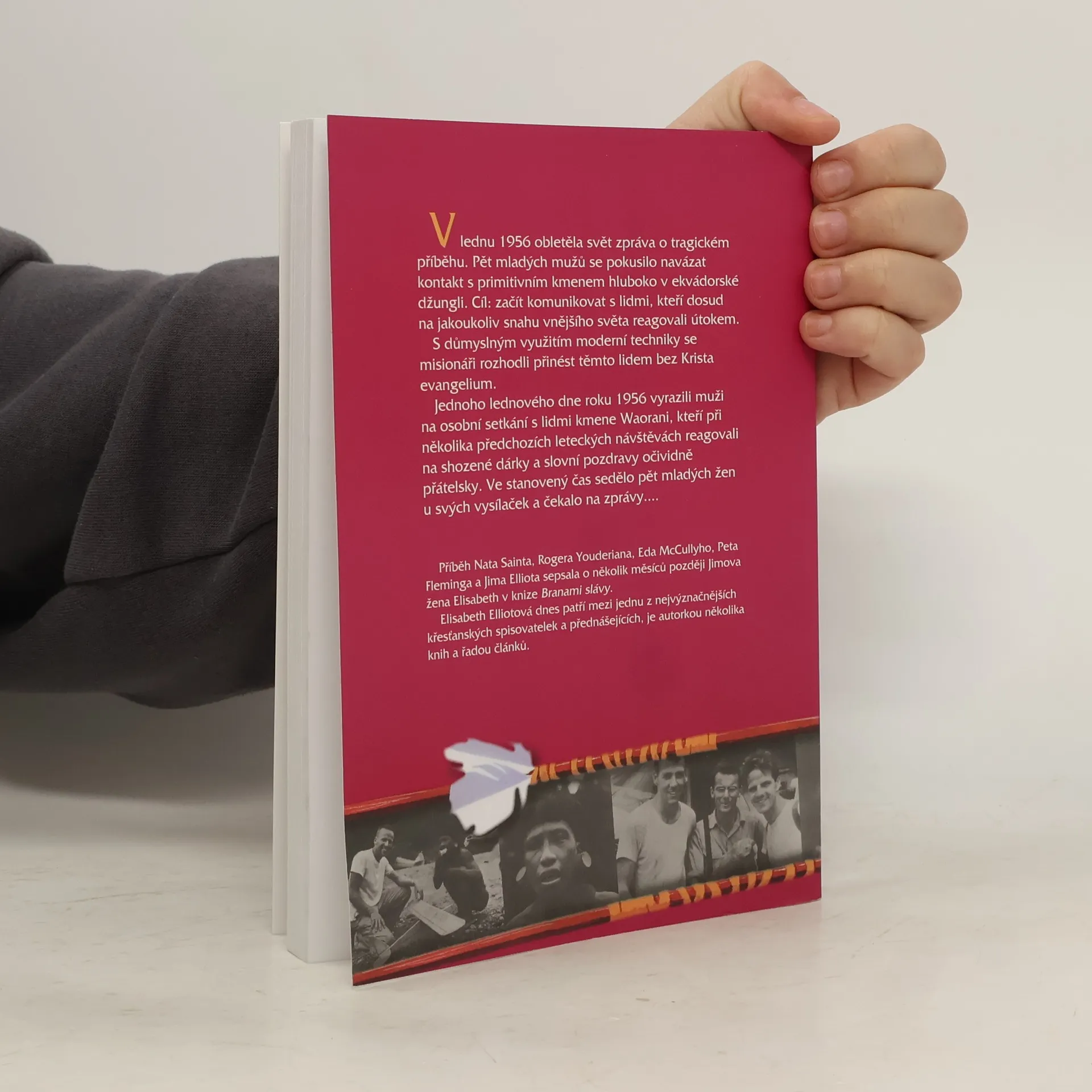 V lednu 1956 obletěla svět zpráva o tragickém příběhu. Pět mladých mužů se pokusilo navázat kontakt s primitivním kmenem hluboko v ekvádorské džungli. Cíl: začít komunikovat s lidmi, kteří dosud na jakoukoliv snahu vnějšího světa reagovali útokem. S důmyslným využitím moderní techniky se misionáři rozhodli přinést těmto lidem bez Krista evangelium. Jednoho lednového dne roku 1956 vyrazili muži na osobní setkání s lidmi kmene Waorani, kteří při několika předchozích leteckých návštěvách reagovali na shozené dárky a slovní pozdravy očividně přátelsky. Ve stanovený čas sedělo pět mladých žen u svých vysílaček a čekalo na zprávy... Příběh Nata Sainta, Rogera Youderiana, Eda McCullyho, Peta Fleminga a Jima Elliota sepsala o několik měsíců později Jimova žena Elisabeth v knize Branami slávy. Elisabeth Elliotová dnes patří mezi jednu z nejvýnačnějších křesťanských spisovatelek a přednášejících, je autorkou několika knih a řady článků.