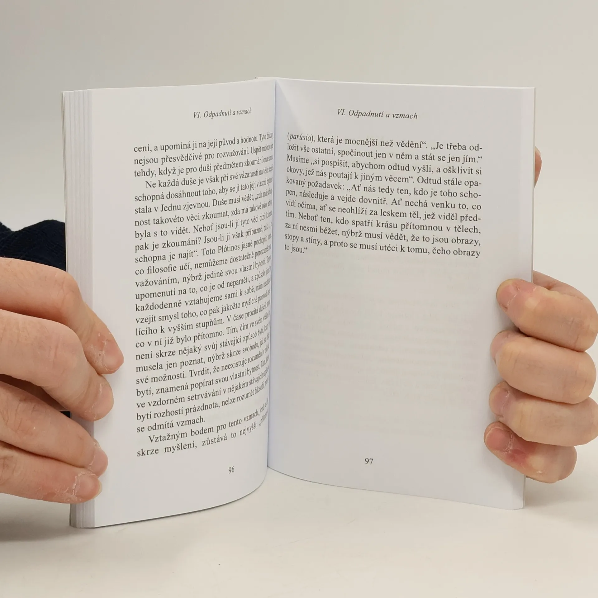 Jaspersovo pojednání o posledním velkém filosofovi antiky, Plótinovi, není suchá analýza filologických detailů a historických vlivů; je spíše meditací, která skrze Plótinův systém proniká k živému myšlení. Ukazuje, že zdánlivě objektivní schéma Plótinovy filosofie je ve skutečnosti obrazem světa sloužícím k tomu, aby bylo možné popsat aktivní a svobodný vzestup a upadání duše; Plótinova metafyzika tak může být i dnes nástrojem pro výklad lidské svobody a životního smyslu.