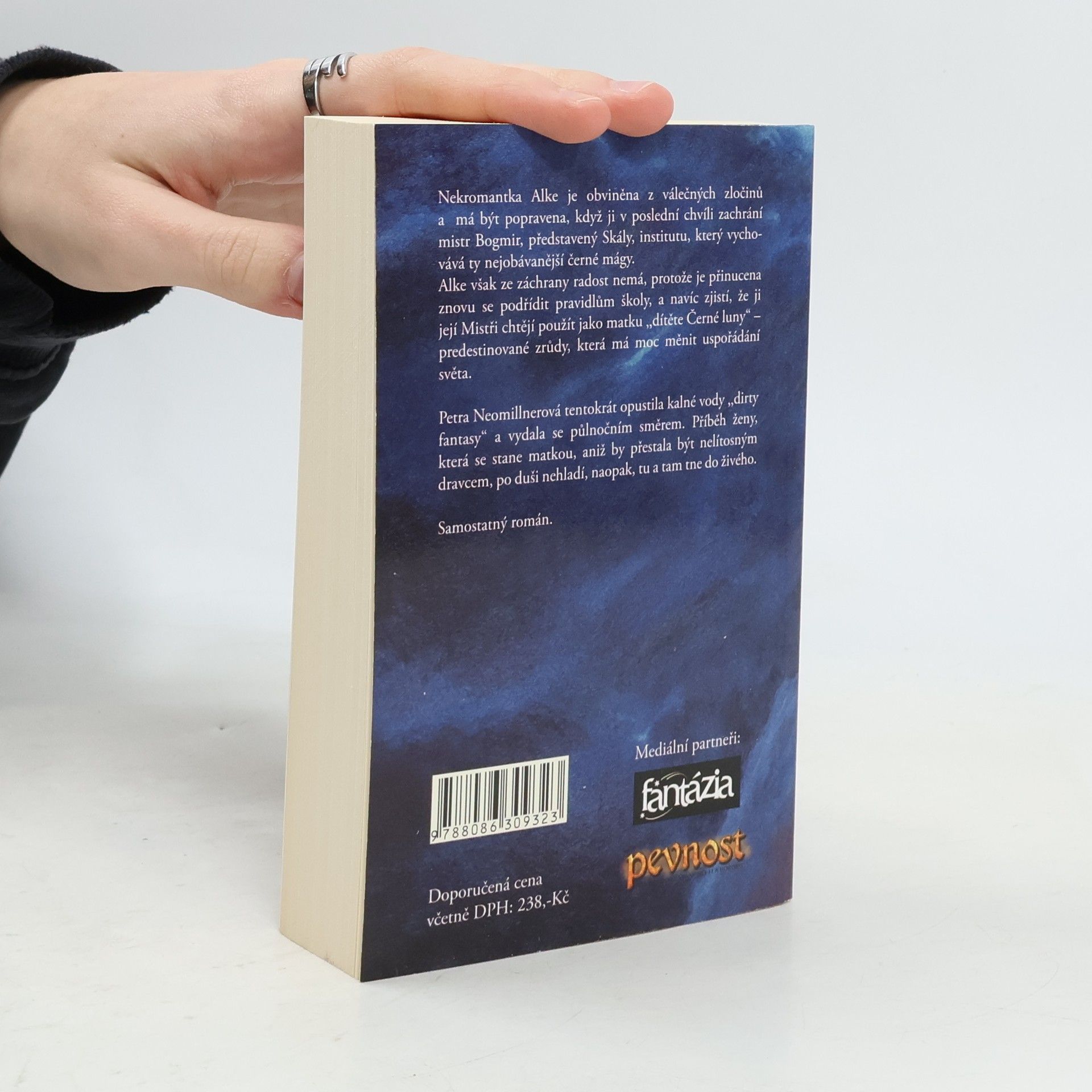 Nekromantka Alke je obviněna z válečných zločinů a má být popravena, když ji v poslední chvíli zachrání mistr Bogmir, představený Skály, institutu, který vychovává ty nejobávanější černé mágy. Alke však ze záchrany radost nemá, protože je přinucena znovu se podřídit pravidlům školy, a navíc zjistí, že ji její Mistři chtějí použít jako matku „dítěte Černé luny“ – predestinované zrůdy, která má moc měnit uspořádání světa. Petra Neomillnerová tentokrát opustila kalné vody „dirty fantasy“ a vydala se půlnočním směrem. Příběh ženy, která se stane matkou, aniž by přestala být nelítostným dravcem, po duši nehladí, naopak, tu a tam tne d