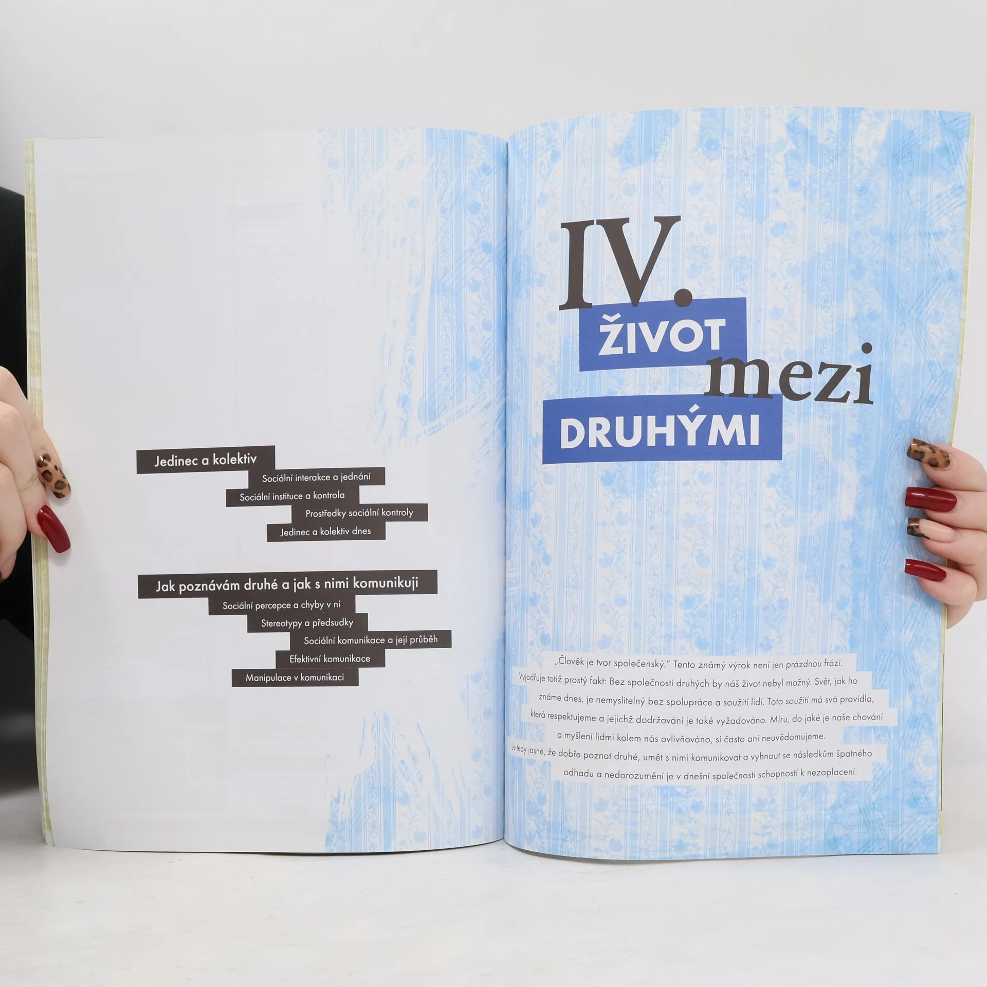Učebnice přistupuje novým způsobem k problematice společenských věd, představujíc učivo s ohledem na každodenní souvislosti a požadavky současných studentů. Texty jsou zpracovány a kontrolovány vysokoškolskými odborníky, což zajišťuje jejich spolehlivost a faktickou přesnost. Je zpracována podle požadavků RVP pro gymnaziální a střední odborné vzdělávání, což umožňuje její využití v obou typech škol. Naplňuje legislativní požadavky jak po stránce obsahu, tak rozvíjením klíčových kompetencí žáků, zohledněním mezipředmětových vztahů a průběžným zařazováním průřezových témat. Učebnice je rozdělena do čtyř tematických celků, které se zaměřují na klíčové výkladové problémy: poznávání skutečnosti, vývoj člověka a vlivy na něj, individuální odlišnost a psychologické základy, a pravidla soužití s druhými. Tyto celky jsou dále děleny na kapitoly a podkapitoly, což odpovídá struktuře pracovního sešitu. Podkapitoly, jako základní jednotky učebnice, jsou buď jednostránkové, nebo dvoustránkové, odpovídající časové dotaci. Učebnice je koncipována tak, aby zajišťovala provázanost jednotlivých podkapitol a zároveň usnadnila odlišení povinného učiva od doplňujících informací.