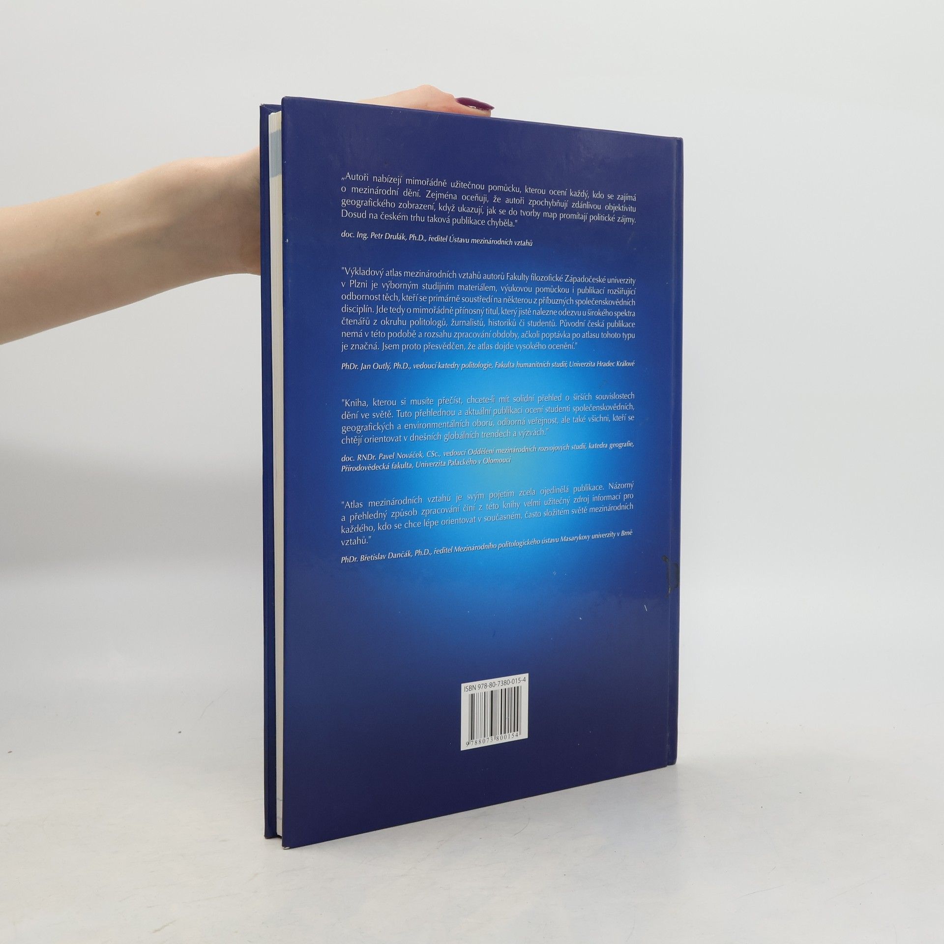 "Výkladový atlas mezinárodních vztahů autorů Fakulty filozofické Západočeské univerzity v Plzni je výborným studijním materiálem, výukovou pomůckou i publikací rozšiřující odbornost těch, kteří se primárně soustředí na některou z příbuzných společenskovědních disciplín. Jde tedy o mimořádně přínosný titul, který jistě nalezne odezvu u širokého spektra čtenářů z okruhu politologů, žurnalistů, historiků či studentů. Původní česká publikace nemá v této podobě a rozsahu zpracování obdoby, ačkoli poptávka po atlasu tohoto typu je značná. Jsem proto přesvědčen, že atlas dojde vysokého ocenění." PhDr. Jan Outlý, Ph.D., vedoucí katedry politologie, Fakulta humanitních studií, Univerzita Hradec Králové