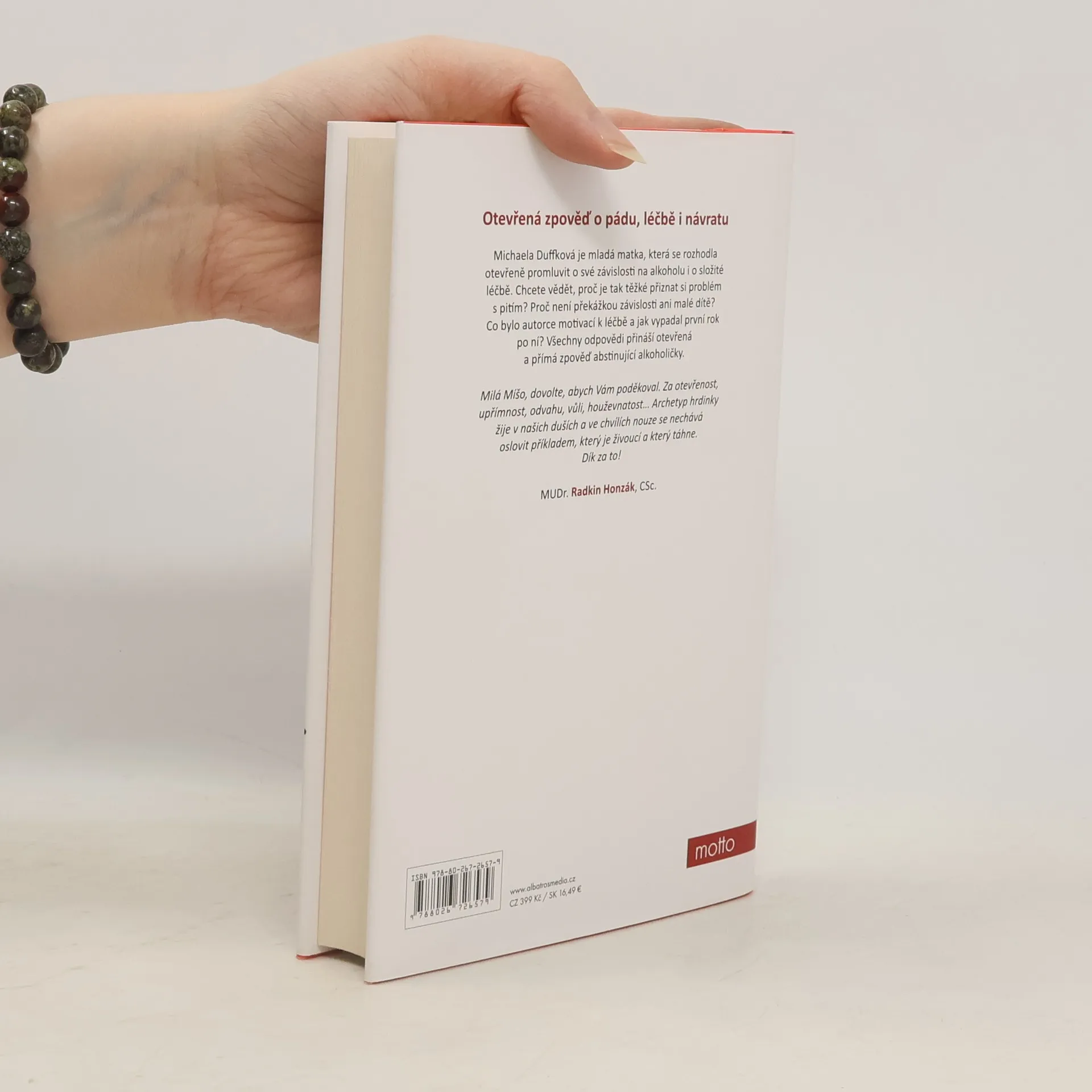 Poslední sklenička… dnes už popáté. Kniha podle blogu, který získal cenu Magnesia Litera. Michaela Duffková je mladá matka, která se rozhodla otevřeně promluvit o své závislosti na alkoholu i o složité léčbě. Chcete vědět, proč je tak těžké přiznat si problém s pitím? Proč není překážkou závislosti ani malé dítě? Co bylo autorce motivací k léčbě a jak vypadal první rok po ní? Všechny odpovědi přináší otevřená a přímá zpověď abstinující alkoholičky.