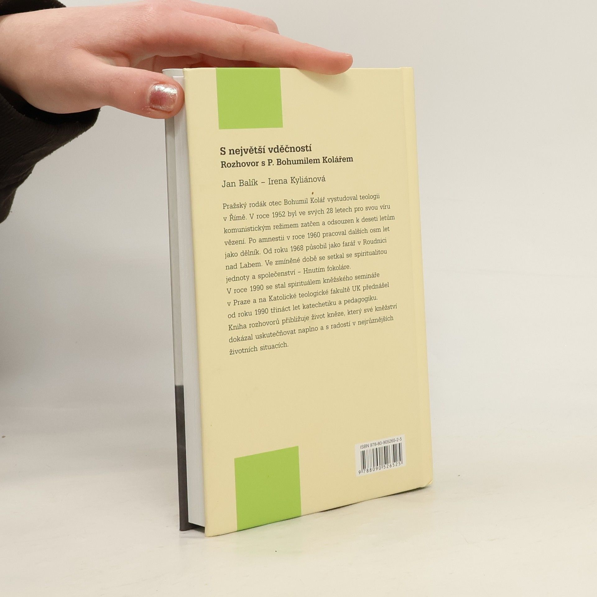 Rozhovor s P. Bohumilem Kolářem / Pražský rodák otec Bohumil Kolář vystudoval teologii v Římě. V roce 1952 byl ve svých 28 letech pro svou víru komunistickým režimem zatčen a odsouzen k deseti letům vězení. Po amnestii v roce 1960 pracoval dalších osm let jako dělník. Od roku 1968 působil jako farář v Roudnici nad Labem. Ve zmíněné době se setkal se spiritualitou jednoty a společenství - Hnutím fokoláre. V roce 1990 se stal spirituálem kněžského semináře v Praze a na Katolické teologické fakultě UK přednášel třináct let katechetiku a pedagogiku. Kniha rozhovorů přibližuje život kněze, který své kněžství dokázal uskutečňovat naplno a s radostí v nejrůznějších životních situacích.