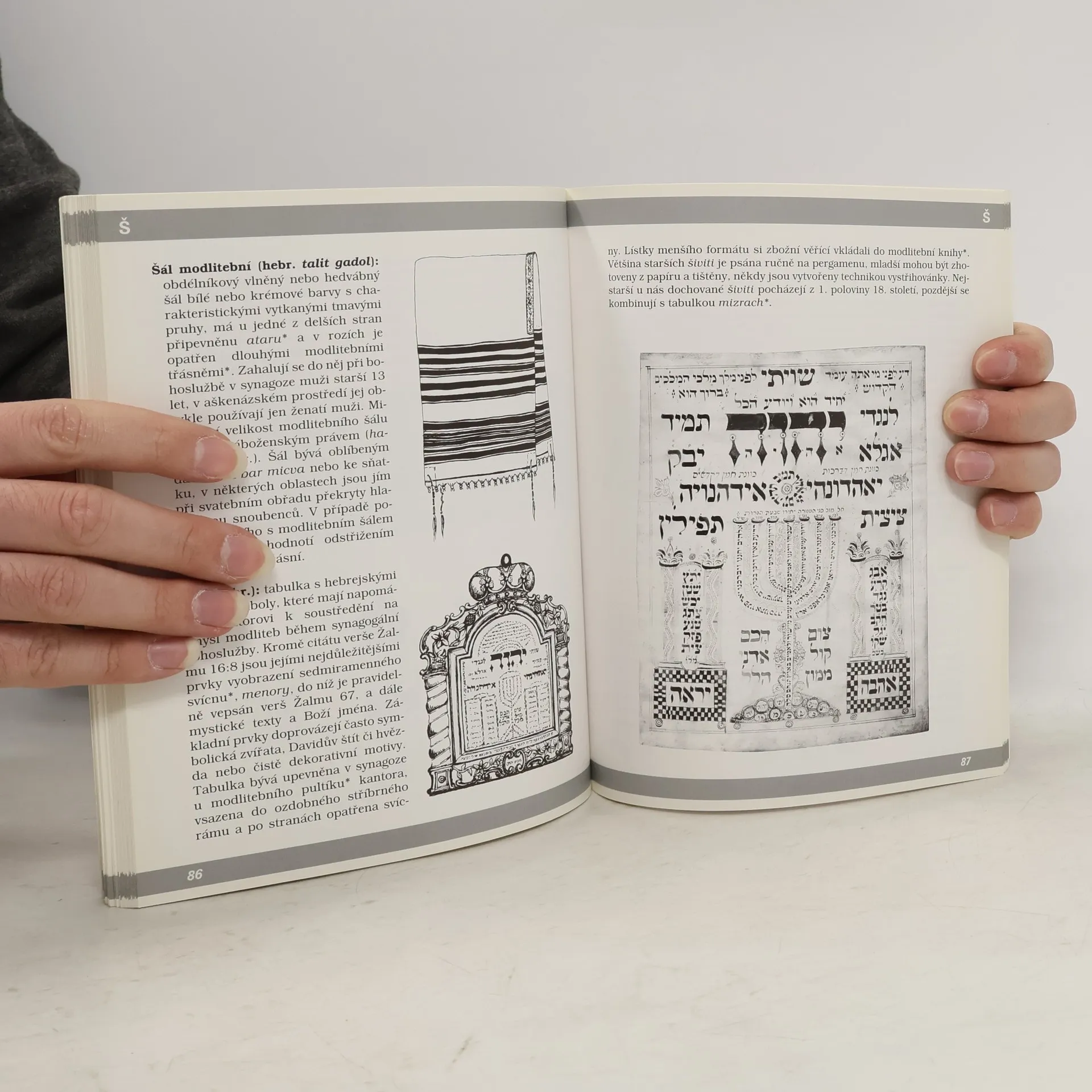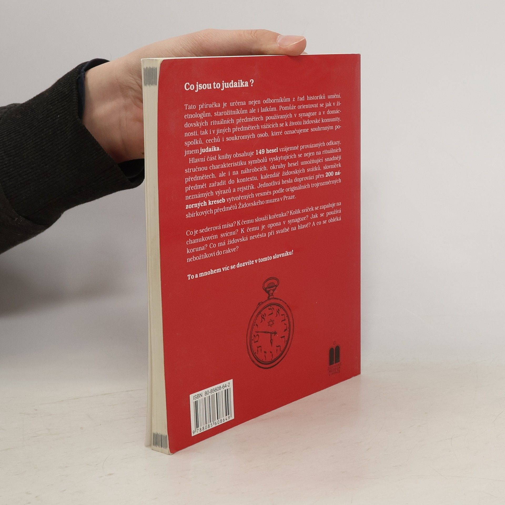 Tato příručka určená nejen odborníkům z řad historiků umění, etnologům, starožitníkům ale i laikům, která pomůže orientovat se jak v židovských rituálních předmětech používaných v synagoze a v domácnosti, tak i v jiných předmětech vážících se k životu židovské komunity, spolků, cechů i soukromých osob, které označujeme souhrnným pojmem judaika. Hlavní část knihy obsahuje 149 hesel vzájemně provázaných odkazy, stručnou charakteristiku symbolů vyskytujících se nejen na rituálních předmětech, ale i na náhrobcích, okruhy hesel umožňující snadněji předmět zařadit do kontextu, kalendář židovských svátků, slovníček neznámých výrazů a rejstřík. Jednotlivá hesla doprovází přes 200 názorných kreseb vytvořených vesměs podle originálních trojrozměrných sbírkových předmětů Židovského muzea v Praze.