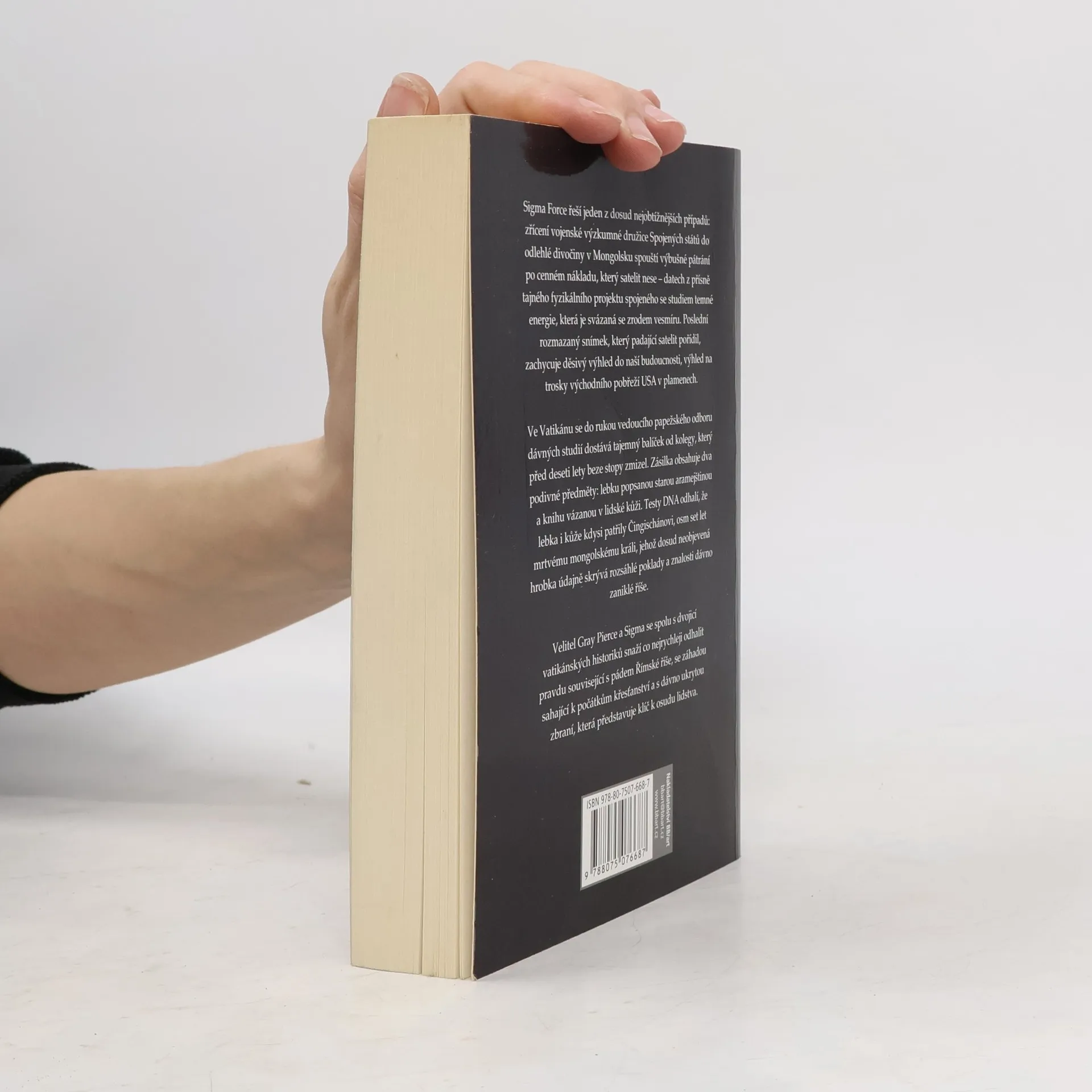 Sigma řeší jeden z dosud nejobtížnějších případů: Zřícení vojenské výzkumné družice Spojených států do odlehlé divočiny v Mongolsku spouští výbušné pátrání po cenném nákladu, který satelit nese – datech z přísně tajného fyzikálního projektu spojeného se studiem temné energie, která je svázaná se zrodem vesmíru. Poslední rozmazaný snímek, který padající satelit pořídil, zachycuje děsivý výhled do naší budoucnosti, výhled na trosky východního pobřeží USA v plamenech. Ve Vatikánu se do rukou vedoucího papežského odboru dávných studií dostává tajemný balíček od kolegy, který před deseti lety beze stopy zmizel. Zásilka obsahuje dva podivné předměty: lebku popsanou starou aramejštinou a knihu vázanou v lidské kůži. Testy DNA odhalí, že lebka i kůže kdysi patřily Čingischánovi, osm set let mrtvému mongolskému králi, jehož dosud neobjevená hrobka údajně skrývá rozsáhlé poklady a znalosti dávno zaniklé říše. Velitel Gray Pierce a Sigma se spolu s dvojicí vatikánských historiků snaží co nejrychleji odhalit pravdu související s pádem Římské říše, se záhadou sahající k počátkům křesťanství a s dávno ukrytou zbraní, která představuje klíč k osudu lidstva.