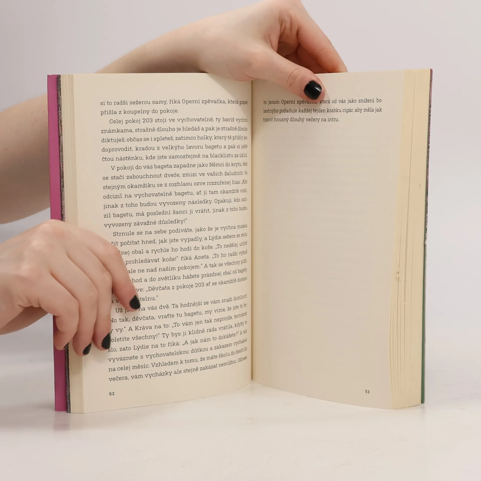 Baletky mají dvě tváře. Tu přední, usměvavou a dokonalou, kterou vidí publikum. A pak tu odvrácenou, když zmizí za oponou, předpisový úsměv jim spadne a tvář se zkřiví do ztrhaného šklebu, protože se dusí. Při tanci totiž nemůžou dýchat pusou. Třeští oči a lapají po dechu. Kdyby baletky někdo takhle nafilmoval, byla by to přehlídka utrpení. K tomu jsou ale trénované. Tak jako hlavní hrdinka tohohle příběhu. Každý den zažívá baletní dril jako v armádě. Ještě jí nebylo čtrnáct, a už je odbornicí na používání projímadel a zvracení, aby si udržela váhu, na ošetřování krvavých palců a stahování prsou. A do toho poznává klubový život v Praze. Jsou devadesátá léta, frčí perník a extáze a ona objevuje sex a zjišťuje, že má nevlastního bratra, který je úplně jiný, než by chtěla. A že její sen stát se baletkou a tančit ve Zlaté kapličce se mění v noční můru. Režisérka a tanečnice Miřenka Čechová vychází z vlastních zkušeností a deníkových zápisků. Její próza je sebeironickým, syrovým a nelítostným obrazem studií na Taneční konzervatoři a pražského života v divokých 90. letech.