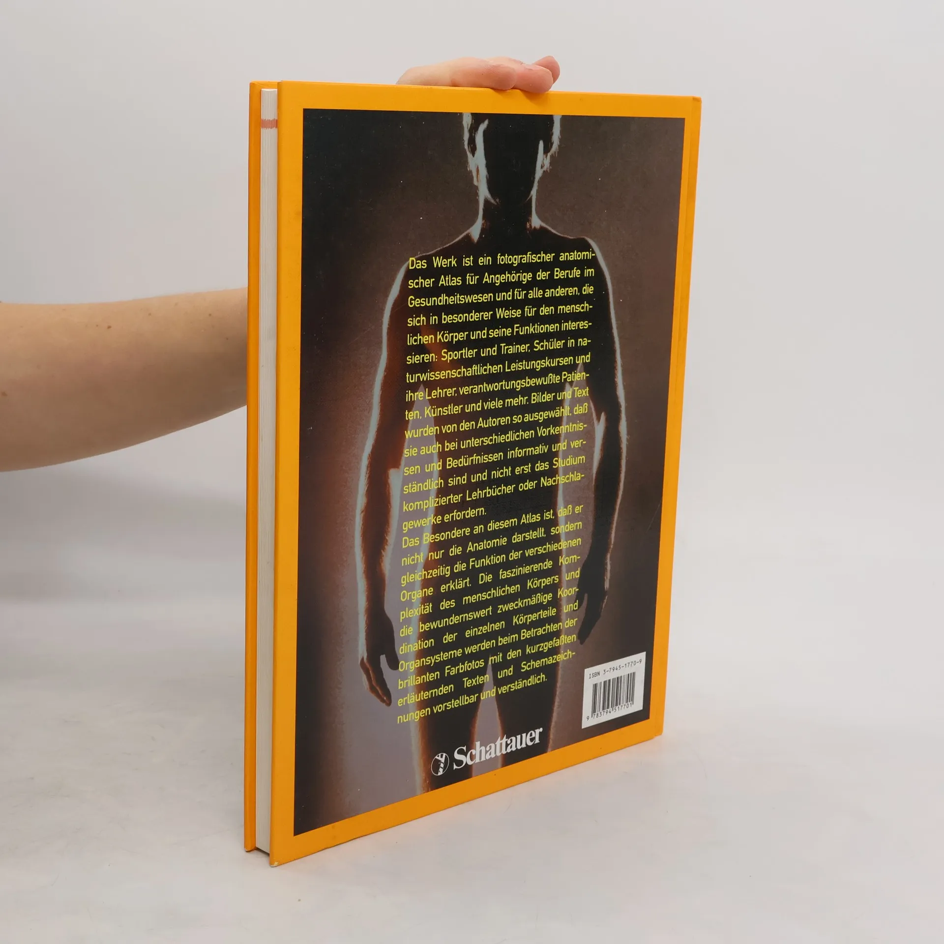 Das Werk ist ein fotografischer anatomischer Atlas für Angehörige der Berufe im Gesundheitswesen und für alle anderen, die sich in besonderer Weise für den menschlichen Körper und seine Funktionen interessieren: Sportler und Trainer, Schüler in naturwissenschaftlichen Leistungskursen und ihre Lehrer, verantwortungsbewußte Patienten, Künstler und viele mehr. Bilder und Text wurden von den Autoren so ausgewählt, daß sie auch bei unterschiedlichen Vorkenntissen und Bedürfnissen informativ sind und nicht erst das Studium komplizerter Lehrbücher oder Nachschlagewerke erfordern. Das Besondere an diesem Atlas ist, daß er nicht nur die Anatomie darstellt, sondern gleichzeitig die Funktion der verschiedenen Organe erklärt. Die faszinierende Komplexität des menschlichen Körpers und die bewundernswert zweckmäßige Koordination der einzelnen Köperteile und Organsysteme werden beim Betrachten der brillanten Farbfotots mit den kurzgefaßten, erläuternden Texten und Schemazeichnungen vorstellbar verständlich.