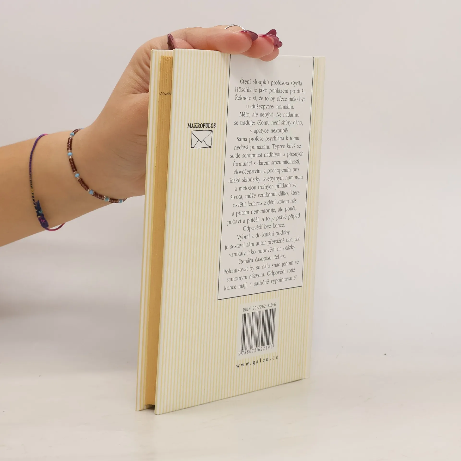 Čtení sloupků profesora Cyrila Höschla je jako pohlazení po duši. Řeknete si, že to by přece mělo být u „dušezpytce" normální. Mělo, ale nebývá. Ne nadarmo se traduje, že: „Komu není shůry dáno, v apatyce nekoupí!" Sama profese psychiatra k tomu nedává pomazání. Teprve když se sejde schopnost nadhledu a přesných formulací s darem srozumitelnosti, člověčenstvím a pochopením pro lidské slabůstky, svébytným humorem a metodou trefných příkladů ze života, může vzniknout dílko, které osvětlí ledacos z dění kolem nás a přitom nementoruje, ale poučí, pobaví a potěší. A to je právě případ Odpovědí bez konce. Vybral a do knižní podoby je sestavil sám autor převážně tak, jak vznikaly jako odpovědi na otázky čtenářů časopisu Reflex. Polemizovat by se dalo snad jenom se samotným názvem...