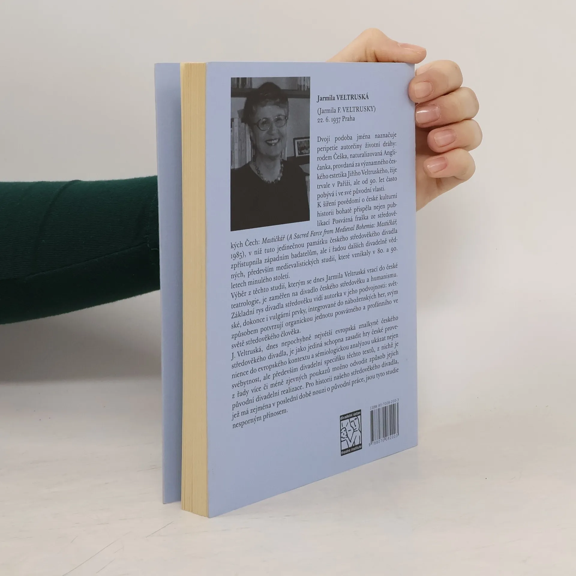 Autorka patří k největším znalcům středověkého divadla a zasloužila se mj. o rozšíření povědomí o českém středověkém divadle zejména svou knihou A Sacred Farce from Medieval Bohemia: Mastičkář. Z jejích studií, publikovaných původně anglicky a francouzsky, jsou pro tento svazek vybrány ty, které věnovala české problematice. Základní rys divadla středověku vidí autorka v jeho podvojnosti: světské, dokonce i vulgární prvky, integrované do náboženských her, svým způsobem potvrzují organickou jednotu posvátného a profánního ve světě středověkého člověka. Pro nás jsou studie Jarmily Veltruské o to zajímavější, že autorka pojednává hry české provenience komparativně, v kontextu evropském.