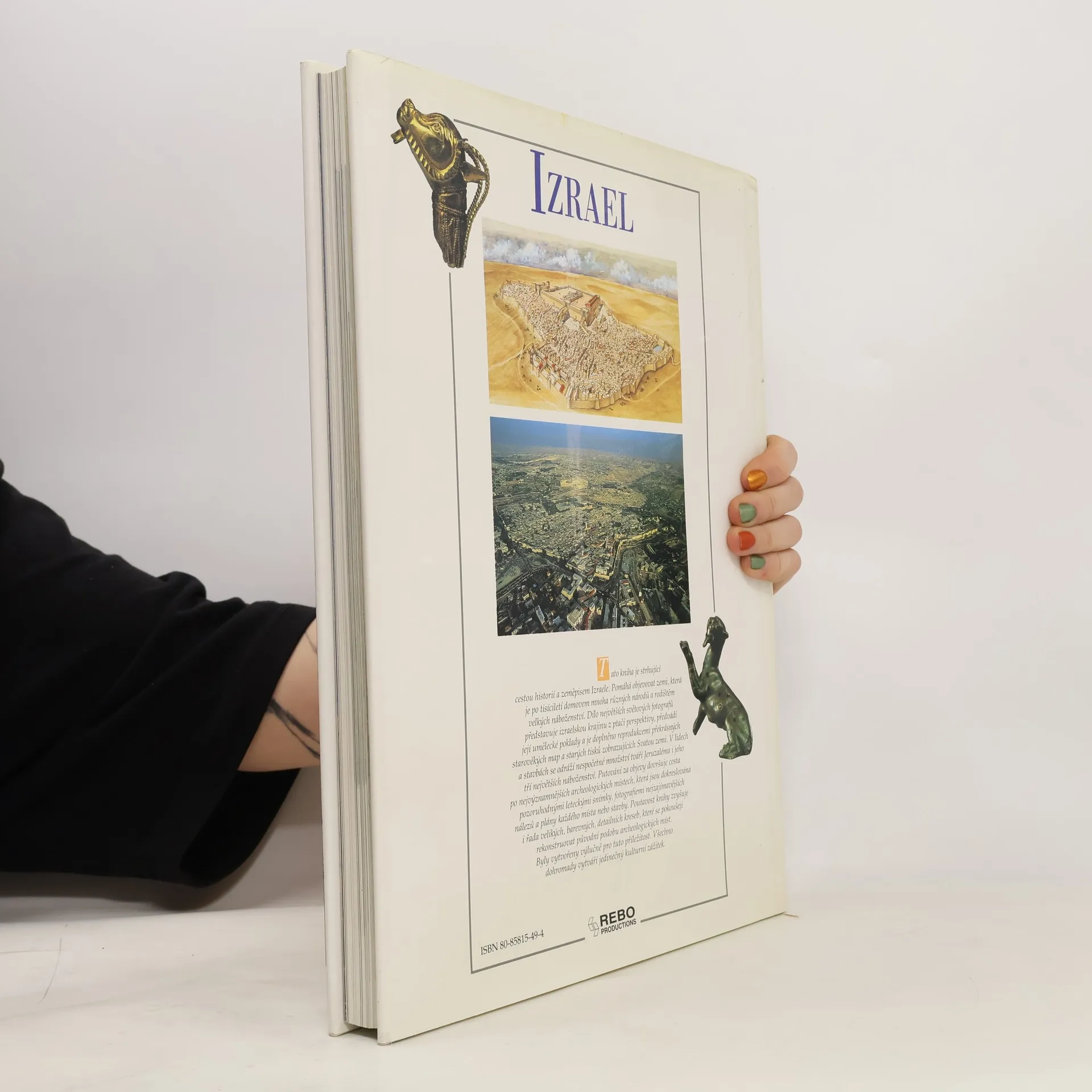 Tato publikace čtenáři pomůže objevovat zemi, která je po tisíciletí domovem mnoha národů a rodištěm velkých náboženství. Letecké snímky izraelské krajiny předních světových fotografů, které ukazují její umělecké poklady, jsou doplněny reprodukcemi starověkých map a starých tisků zobrazujících Svatou zemi. Putování Izraelem dovršuje cesta po archeologických nalezištích. Poutavost knihy zvyšuje i řada barevných detailních kreseb, které se pokoušejí rekonstruovat původní podobu míst odkrytých při archeologických výzkumech. Barev. il., mapy, plány ; 36 cm, vázaná s přebalem, formát obří 2°.