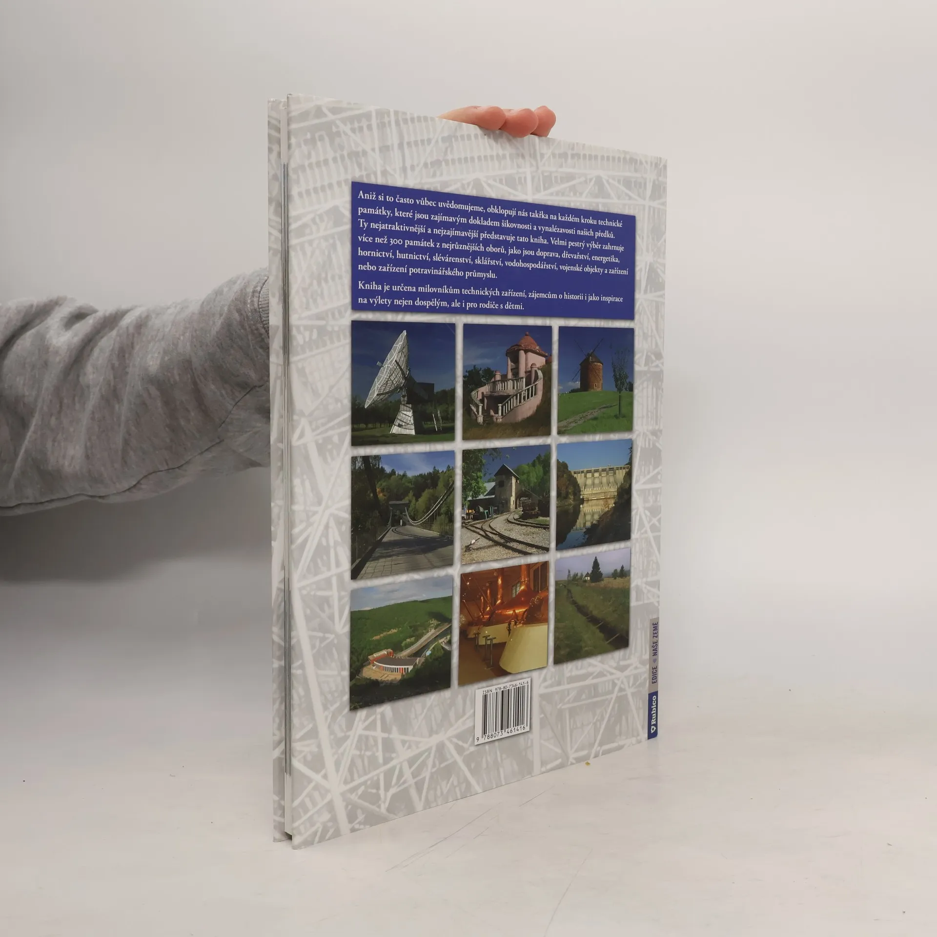 "Technické památky nás obklopují takřka na každém kroku. Tato kniha představuje ty nejatraktivnější a nejzajímavější. Velmi pestrý výběr zahrnuje více než 300 památek z nejrůznějších oborů, jako jsou doprava, dřevařství, energetika, hornictví, hutnictví, slévárenství, sklářství, vodohospodářství, vojenské objekty a zařízení nebo zařízení potravinářského průmyslu. Kniha je určena milovníkům technických zařízení, zájemcům o historii i jako inspirace na výlety nejen dospělým, ale i pro rodiče s dětmi. "