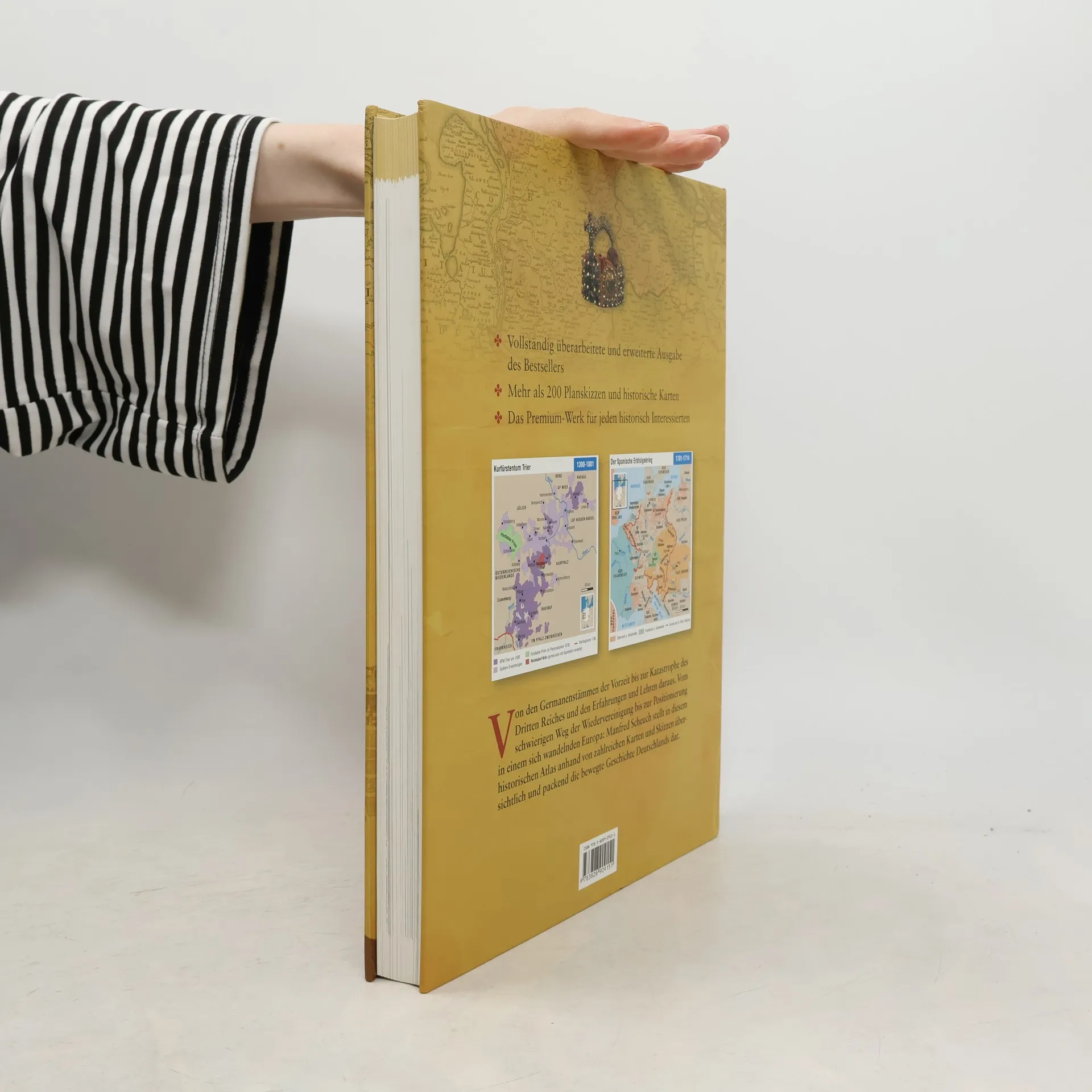 Manfred Scheuch hat mit seinem Historischen Atlas Deutschland erstmals einen detaillierten Überblick der einzelnen Territorien Deutschlands erstellt und präsentiert übersichtlich die oftmals komplizierte Entwicklung der zahllosen Grafschaften und Reichsstädte, Kurfürstentümer und Herzogtümer, Erzstifte und Abteien. Mehr als 200 Planskizzen und historische Karten ermöglichen einen Überblick über die wichtigsten Stationen des Gesamtstaates: Von den Germanenstämmen der Vorzeit über das Frankenreich als Vorstufe zum Ersten Reich, das als Heiliges Römisches Reich eine Sonderstellung in Europa einnahm. Vom Zerfall in viele kleine Herrschaftsgebiete bis zur größten Katastrophe der deutschen Geschichte und den Erfahrungen daraus. Vom schwierigen Weg zur Wiedervereinigung in einem sich wandelnden Europa. Neben den heutigen Bundesländern werden auch jene Gebiete behandelt, die sich nur vorübergehend im Verband des Reiches befanden. Ein ausführlicher Anhang über die wichtigsten Kaiser und Könige, Staatsoberhäupter und Regierungschefs komplettiert dieses Geschichtsbuch, das sowohl als Nachschlagewerk zur raschen Orientierung als auch zur Vertiefung in Teilgebiete der deutschen Geschichte funktioniert.