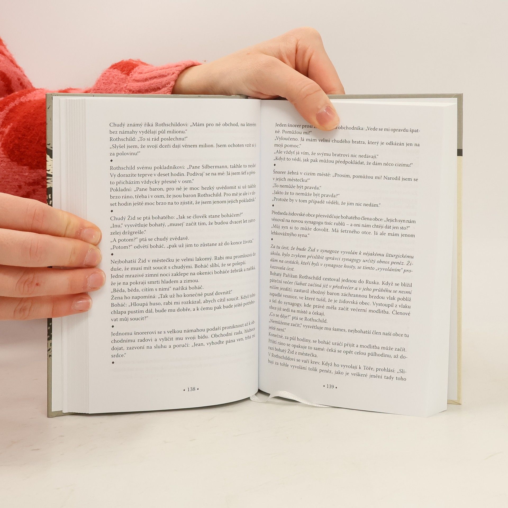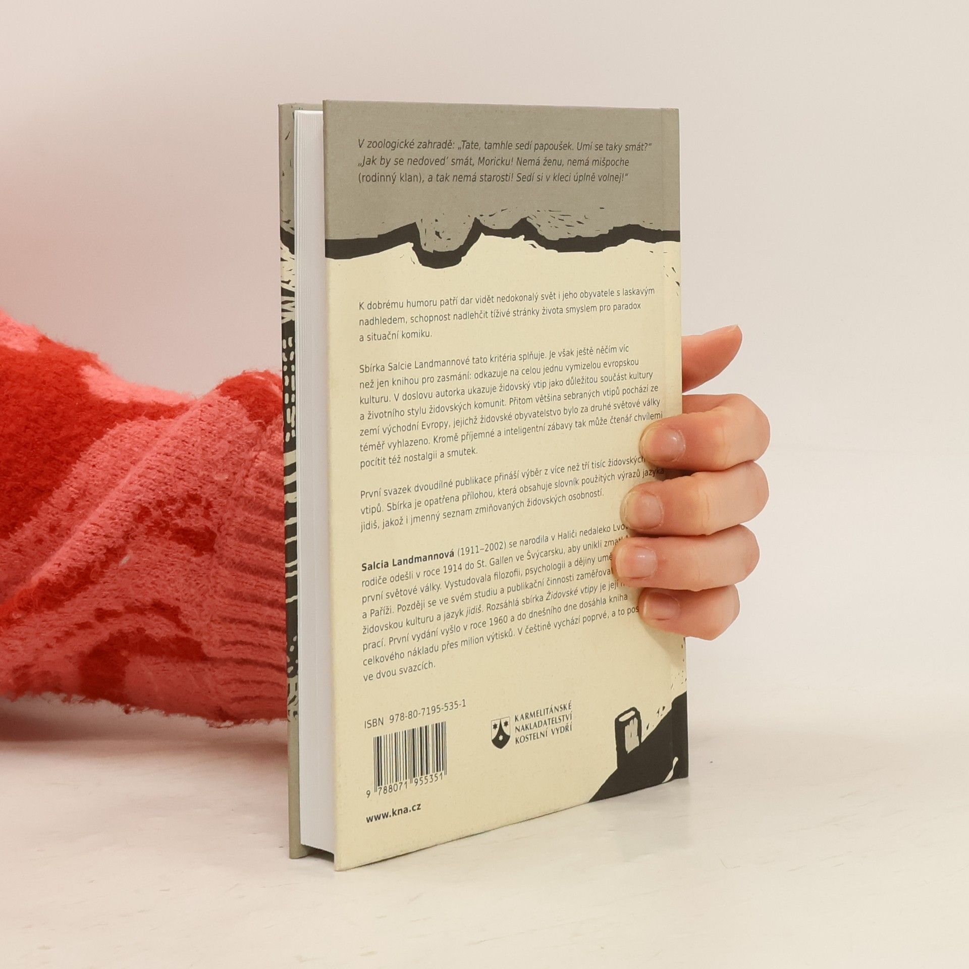 Židovské vtipy 1. V zoologické zahradě: „Tate, tamhle sedí papoušek. Dovede se taky smát?“„Jak by se nedoved’ smát, Moricku! Nemá ženu, nemá mišpoche (rodinný klan), a tak nemá starosti! Sedí si v kleci úplně volnej!“ K dobrému humoru patří dar vidět nedokonalý svět i jeho obyvatele s laskavým nadhledem, schopnost nadlehčit tíživé stránky života smyslem pro paradox a situační komiku. Sbírka Salcie Landmannové tato kritéria splňuje. Je však ještě něčím víc než jen knihou pro zasmání: odkazuje na celou jednu vymizelou evropskou kulturu. V doslovu autorka ukazuje židovský vtip jako důležitou součást kultury a životního stylu židovských komunit. Přitom většina sebraných vtipů pochází ze zemí východní Evropy, jejichž židovské obyvatelstvo bylo za druhé světové války téměř vyhlazeno. Kromě příjemné a inteligentní zábavy tak může čtenář chvílemi pocítit též nostalgii a smutek. První svazek dvoudílné publikace přináší výběr z více než tří tisíc židovských vtipů. Sbírka je opatřena přílohou, která obsahuje slovník použitých výrazů jazyka jidiš, jakož i jmenný seznam zmiňovaných židovských osobností.
