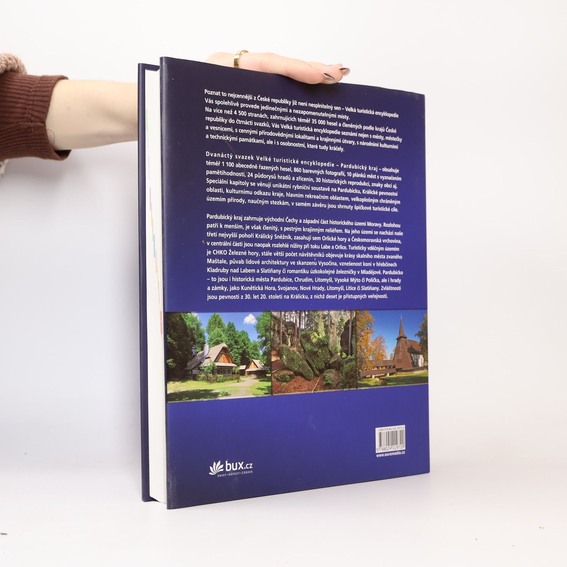 Dvanáctý svazek Velké turistické encyklopedie obsahuje zhruba 1090 abecedně řazených hesel, 860 barevných fotografií, 10 plánků měst s vyznačením pamětihodností, 24 půdorysů hradů a zřícenin, 30 historických reprodukcí, znaky obcí aj. Speciální kapitoly se věnují rybniční soustavě na Pardubicku, Králické pevnostní oblasti, kulturnímu odkazu kraje a významným turistickým cílům. K nim patří CHKO Železné hory, skalní město Maštale, lidová architektura ve skanzenu Vysočina či úzkokolejná železnička v Mladějově. Pardubicko – to jsou i historická města Pardubice, Chrudim, Litomyšl, Vysoké Mýto či Polička, ale i hrady a zámky, jako Kunětická Hora, Svojanov, Nové Hrady, Litomyšl, Litice či Slatiňany.