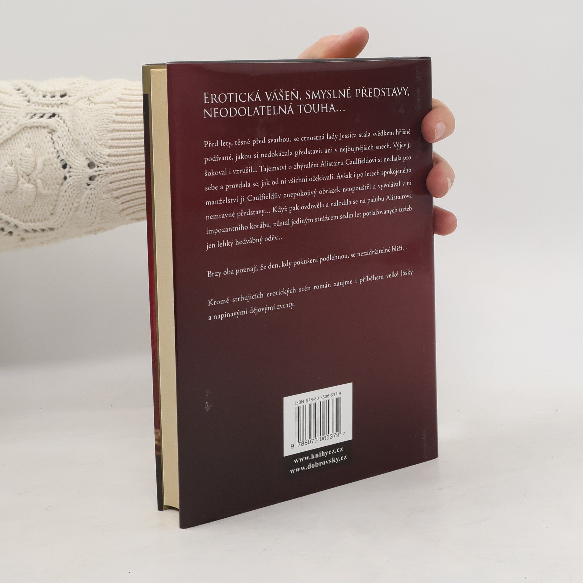 Před sedmi lety, v předvečer své vlastní svatby, se ctnostná a spořádaná lady Jessica Sheffieldová stala svědkem hříšné podívané, jakou si taková nevinná mladá dáma nikdy nedokázala představit. Tento výjev ji šokoval a podivně vzrušil zároveň. Tajemství o zhýralém Alistairu Caulfieldovi si nechala pro sebe a provdala se, jak od ní všichni očekávali. Avšak i po dlouhých letech poklidného a šťastného manželství ji Caulfieldův obrázek neopouštěl a vyvolával v ní nemravné představy… …o to sladší pak byla odměna. Alistair utekl od představy nádherné lady Jessiky s vášnivým pohledem v očích až do Západní Indie. Coby úspěšný obchodník měl už jen málo společného s chlípníkem, jakého kdysi znala. Když se čerstvě ovdovělá Jessica nalodila na palubu jeho impozantního korábu na cestu přes oceán, zůstane jediným strážcem sedm let potlačovaných tužeb jen pár vrstev jemného hedvábí. Brzy oba poznají, že den, kdy pokušení podlehnou, se nezadržitelně blíží…