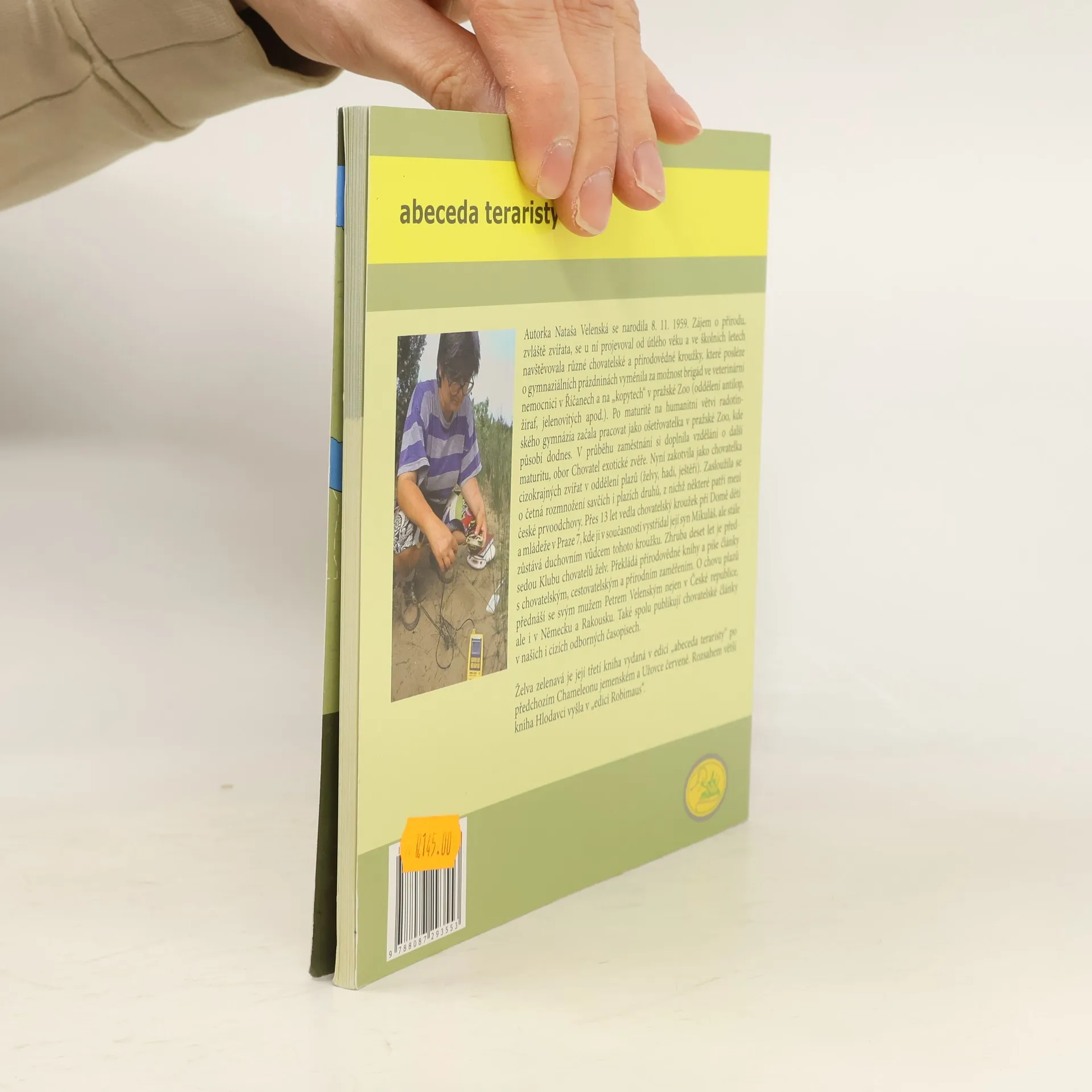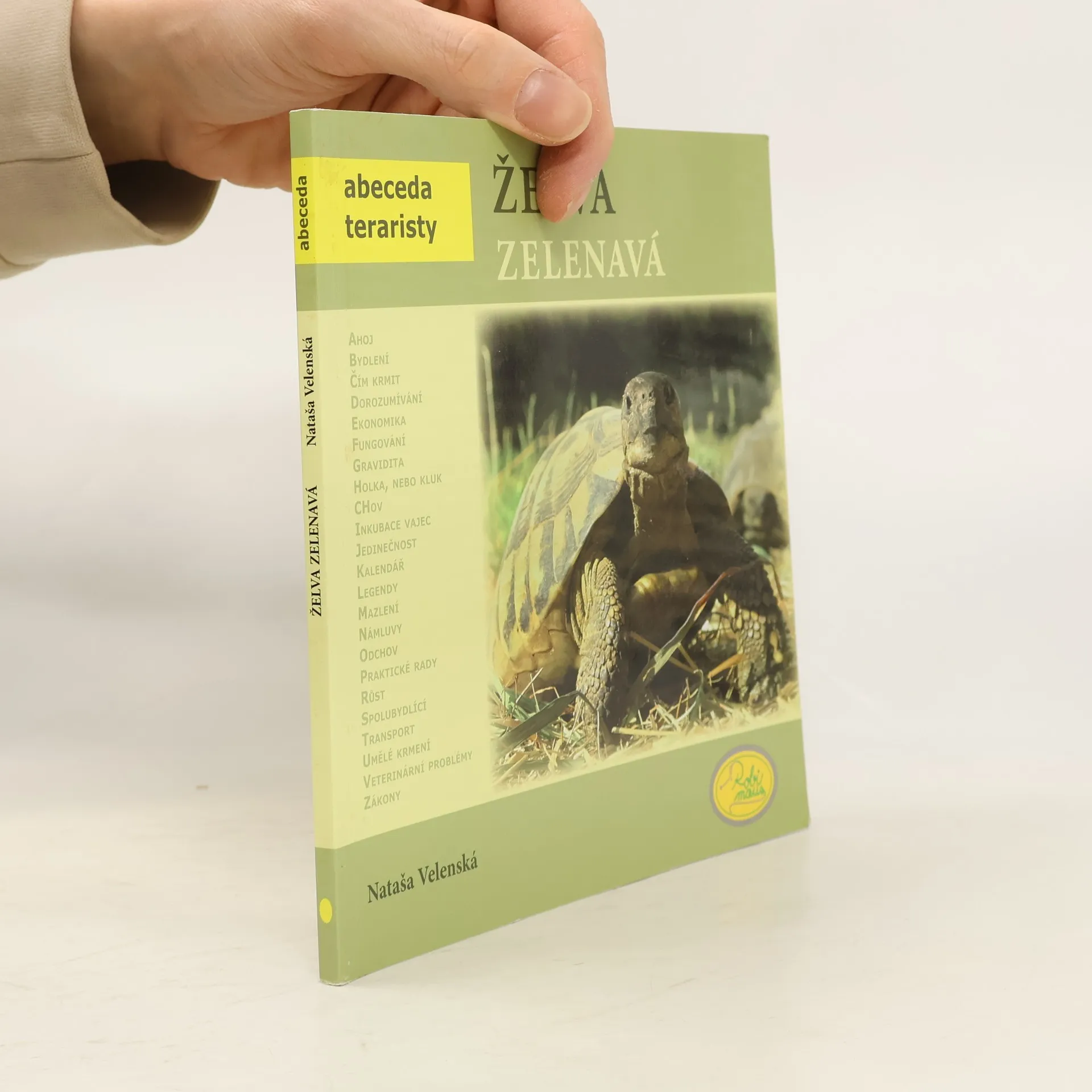 Autorka, paní Nataša Velenská, naše přední odbornice na chov želv, již řadu let působí v pražské ZOO. V knize obsáhle popisuje vše, co se týká chovu a odchovu Testudo hermanni - želvy zelenavé. Pro začínající teraristy je kniha absolutním základem, ale mnoho zajímavých a poučných poznatků zde naleznou i zkušení chovatelé. Nová kniha edice Abeceda teraristy přibližuje nejčastěji chovanou suchozemskou Želvu zelenavou (Testudo hermanni). Autorka Nataša Velenská v knize popisuje základní a potřebné informace pro chov těchto želv, od krmení, bydlení, růstu, až po rozmnožování či veterinární problémy. Kapitoly jsou řazeny podle abecedních hesel, doplněné množstvím fotografií a popisů. V každém výtisku je vložen arch, podle kterého můžete svou želvu jednoduše a přesně měřit a tím sledovat její růst. Údaje si můžete zaznamenat do příslušných kolonek na druhé straně archu.