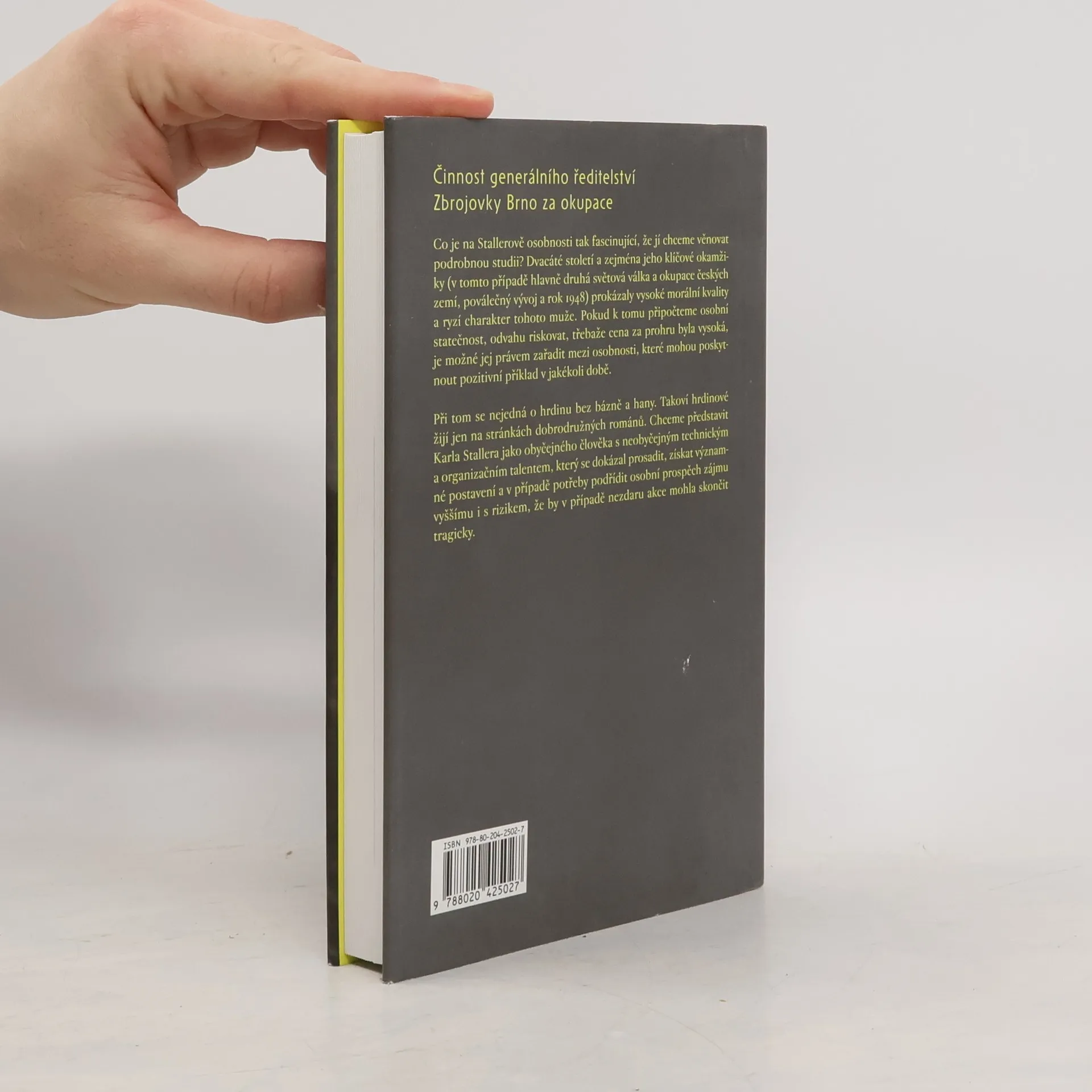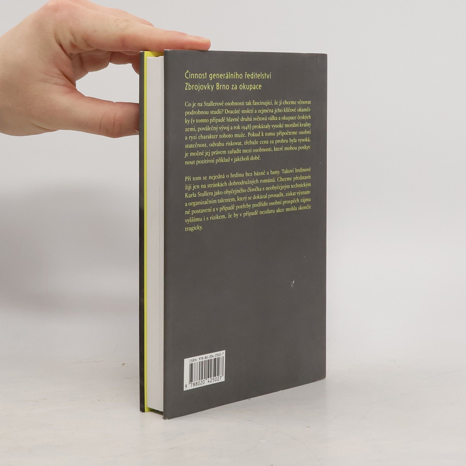 Činnost generálního ředitelství Zbrojovky Brno za okupace Ing. Karel Staller (1896-1975), rodák z Velké Bíteše, se v období mezi světovými válkami ve službách brněnské Zbrojovky vypracoval na jednoho z nejdůležitějších zbrojních techniků Československé republiky (mj. se podílel na konstrukci legendárního kulometu BREN) a nakonec se stal vrchním ředitelem podniku. Ve vedení Zbrojovky Brno setrval i celou druhou světovou válku, kdy jako náměstek generálního ředitele rozehrál smrtelně nebezpečnou partii v podobě spolupráce s československým vojenským odbojem. Biografii tohoto pozapomenutého „obyčejného hrdiny“, doplňují dva další příběhy. První je věnován domácí odbojové akci Zbrojovky Brno, spočívající v organizaci ilegálních přechodů československých důstojníků do Polska. Druhý pak akci zahraniční, která měla za cíl převést co nejvíce peněz Zbrojovky deponovaných v zahraničí na vznikající zahraniční exilové vedení.
