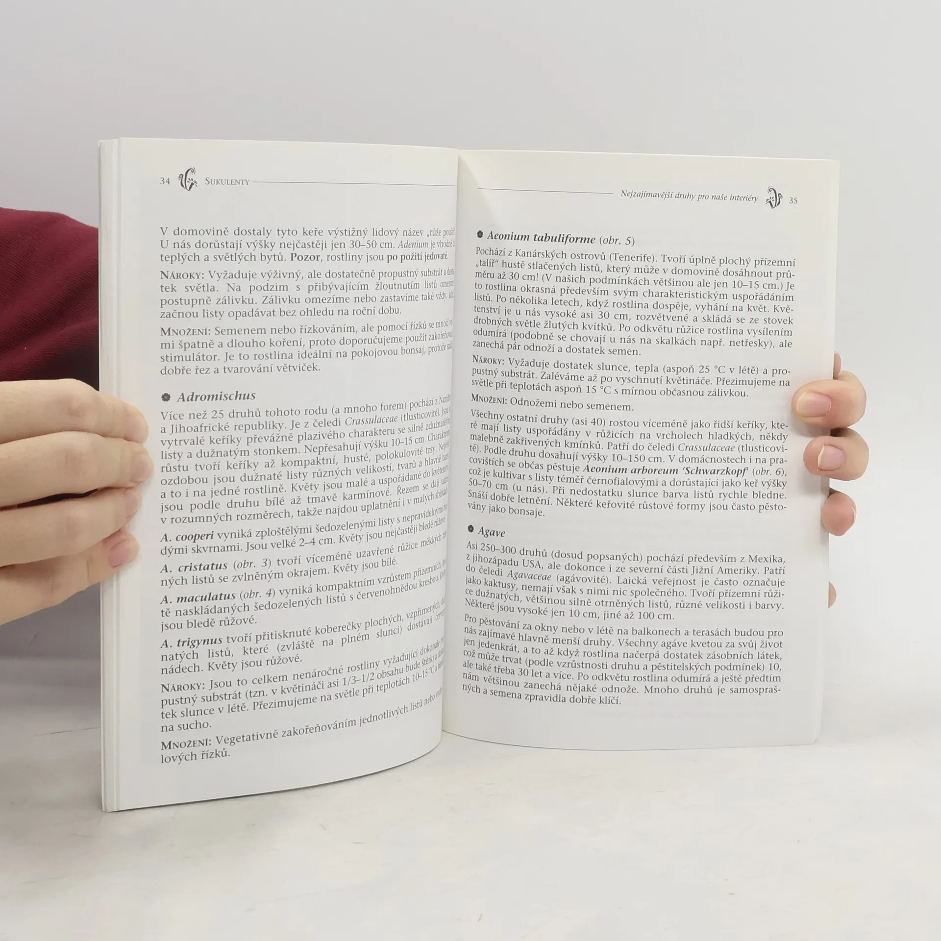 Na stránkách této publikace se seznámíte s více než 100 druhů sukulentů, tj. rostlin, které mají vyvinutou schopnost hromadit vodu pro přežití v období sucha. Zkušení pěstitelé, Petr Pasečný a Jaroslav Ullmann, vybrali z bohatého sortimentu nejkrásnější, nejčastěji pěstované a nejzajímavější druhy vhodné pro naše interiéry, případně pro lodžie a balkony. Představeny jsou druhy nenáročné, vhodné pro začátečníky a do jakýchkoli podmínek, stejně tak i druhy určené pouze velmi zkušeným pěstitelům. Většina z nich se k nám začala dovážet a šířit se mezi běžné pěstitele až po otevření hranic a konkrétní informace týkající se jejich pěstování dosud chyběly. Tuto mezeru vyplňuje právě naše kniha.
