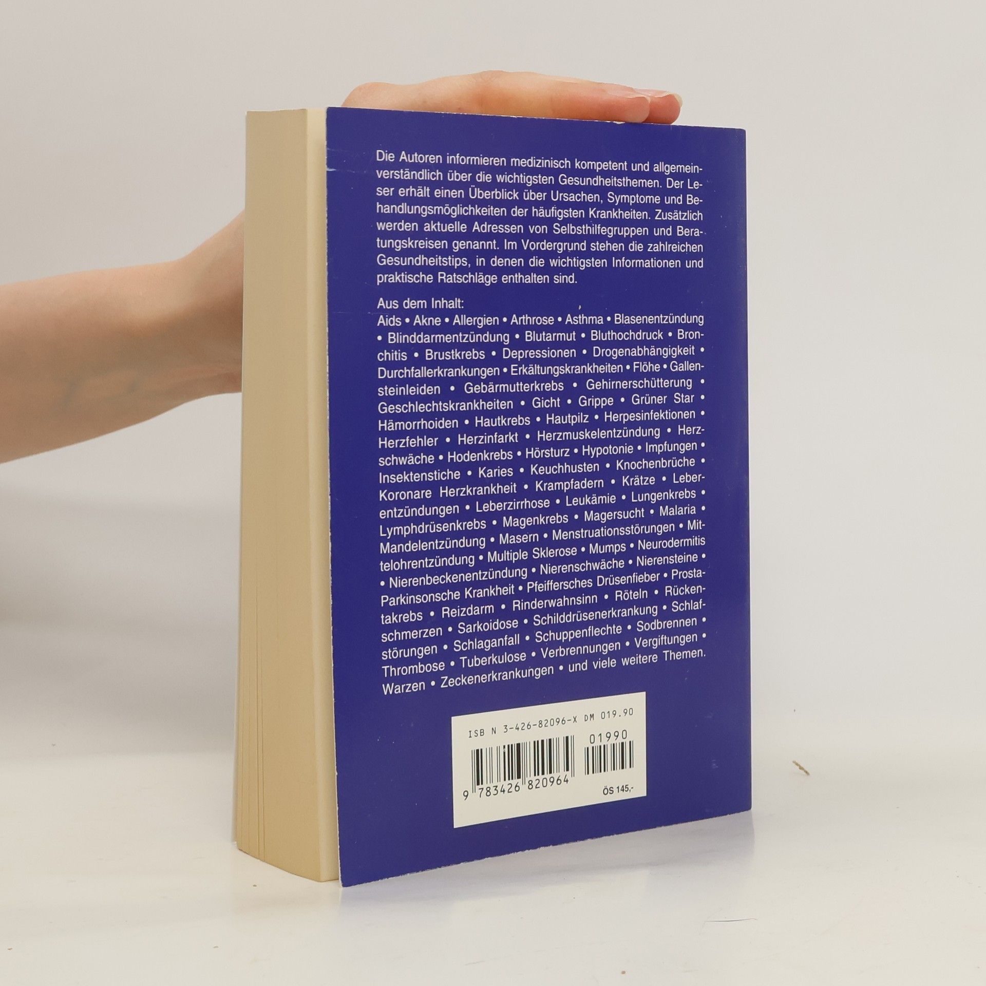 Der Autoren informieren medizinisch kompetent und allgemeinverständlich über die wichtigsten Gesundheitsthemen. Der Leser erhält einen Überblick über Ursachen, Symptome und Behandlungsmöglichkeiten der häufigsten Krankheiten. Zusätzlich werden aktuelle Adressen von Selbsthilfegruppen und Beratungskreisen genannt. Im Vordergrund stehen die zahlreichen Gesundheitstips, in denen die wichtigsten Informationen und praktische Ratschläge enthalten sind.