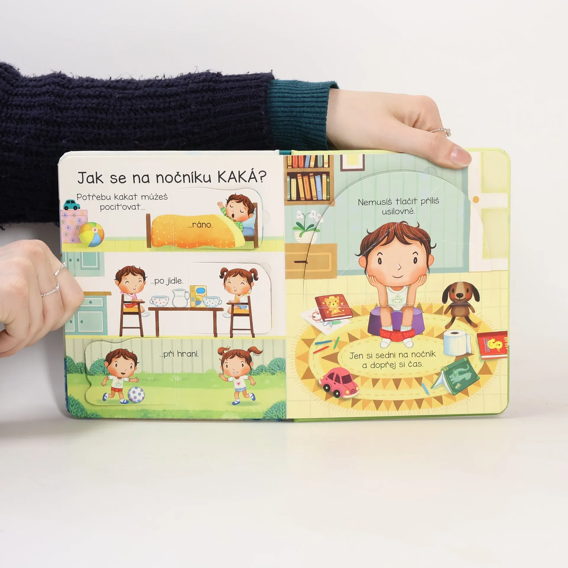 K čemu je nočník, proč ho potřebujeme a jak se používá? Velkou změnu v podobě přechodu na nočník můžete svému dítěti vysvětlit různě, například pomocí jednoduché knížky. Toto obrázkové leporelo s odklápěcími okénky je ideálním pomocníkem pro všechny malé děti, které se učí chodit na nočník. Půvabné ilustrace jsou doprovázeny jednoduchým textem, který něžně povzbuzuje dítě k přechodu z plen na nočník a posléze i na záchod. České vydání publikace nakladatelství Usborne.