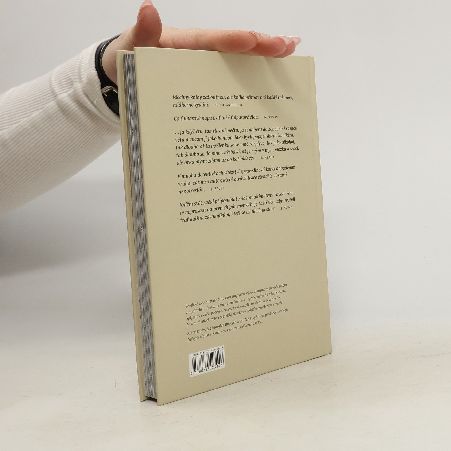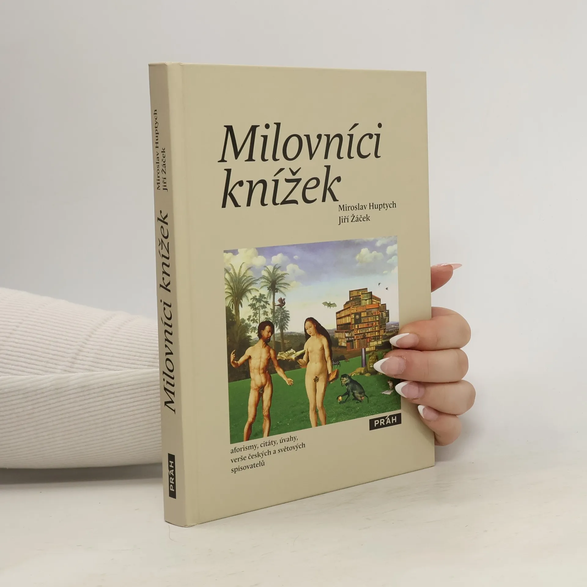Poetické fotomontáže Miroslava Huptycha, výběr aforismů světových autorů a myslitelů k tématu psaní a čtení knih a v neposlední řadě úvahy, fejetony, epigramy i verše padesáti českých spisovatelů, to všechno dělá z knihy Milovníci knížek milý a přátelský dárek pro každého zapáleného čtenáře. Autorská dvojice Miroslav Huptych a Jiří Žáček vydala už před lety antologii českých aforistů. Sami jsou známými českými básníky.