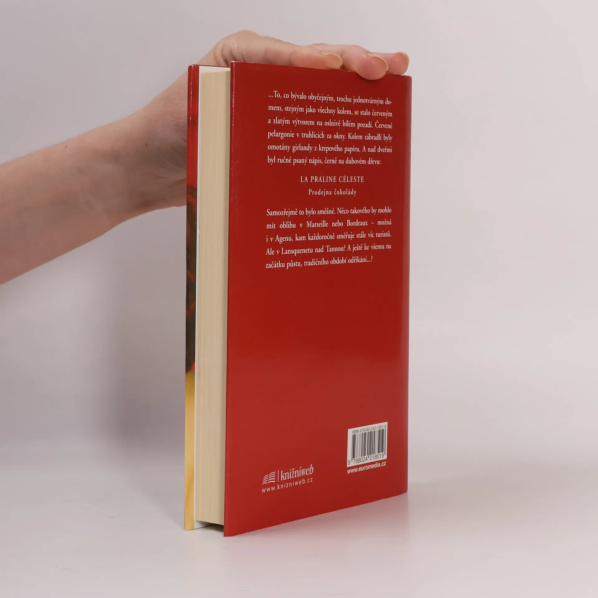 Když se do francouzské vesnice Lansquenet nad Tannou bůhvíodkud přistěhuje exoticky vyhlížející cizinka, Vianne Rocherová, a otevře si tu prodejnu čokolády přímo proti kostelu, otec Reynaud v ní od počátku vidí vážné nebezpečí pro své stádečko, především nyní, na počátku období půstu, kdy by si lidé měli tradičně odpírat světská potěšení. Kněz proto nově příchozí, v níž odhaluje pokušitelku k hříchu, vyhlašuje otevřený boj. Viannin obchod se najednou stává předmětem tajemné šeptandy, skvělou příležitostí pro donašeče, farizejsky rozhořčené ovzduším hříchu a toužícími se osvědčit jako poslušné ovečky. Na druhé straně krámek je místo, jež neodolatelně přitahuje mlsné jazýčky. Kdo by také mohl odolat tak sladkému pokušení? Za ty dva zdrávasy, které otec Reynaud za porušení půstu nařizuje, to přece stojí! Vianne se však svých odpůrců nezalekne a rozhodne se, že na Velikonoce uspořádá Čokoládový festival. Její plán rozdělí obec na dva tábory. Následuje střet, jenž je církví vyostřen v "čokoládovou bitvu". Začíná to vypadat, že velebnost církve může být ohrožena pohanskou vášní pro čokoládové opojení. Můžete si být jisti, že při čtení tohoto hravého a možná i trochu uličnického příběhu budete mít bez ustání chuť na čokoládu. Román Čokoláda je literárním požitkem pro všechny smysly.