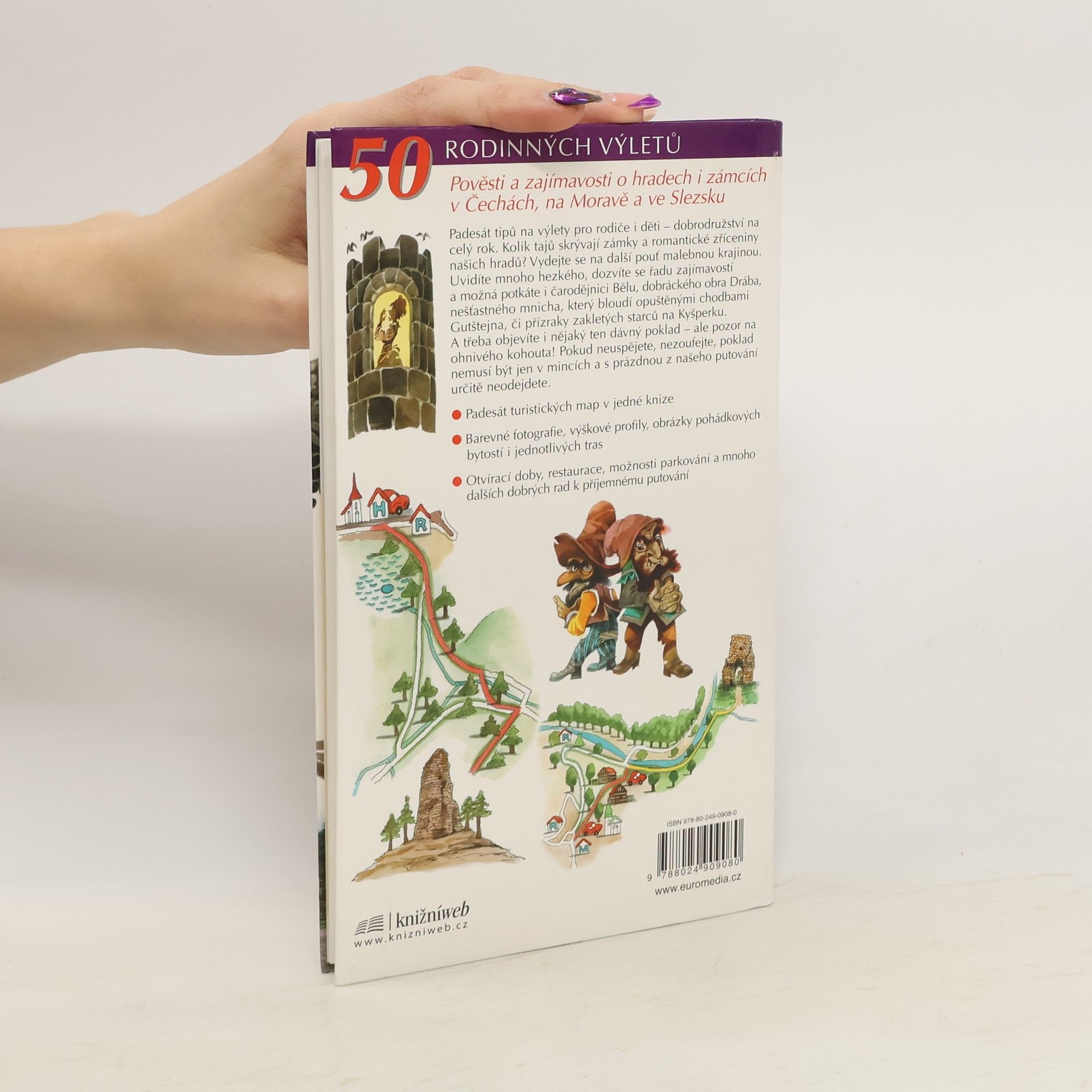 Padesát tipů na výlety pro rodiče i děti - dobrodružství na celý rok. Kolik tajů skrývají zámky a romantické zříceniny našich hradů? Vydejte se na další pouť malebnou krajinou. Uvidíte mnoho hezkého, dozvíte se řadu zajímavostí a možná potkáte i čarodějnici Bělu, dobráckého obra Drába, nešťastného mnicha, který bloudí opuštěnými chodbami Gutštejna, či přízraky zakletých starců na Kyšperku. A třeba objevíte i nějaký ten dávný poklad - ale pozor na ohnivého kohouta! Pokud neuspějete, nezoufejte, poklad nemusí být jen v mincích a s prázdnou z našeho putování určitě neodejdete. Padesát turistických map v jedné knize. Barevné fotografie, výškové profily, obrázky pohádkových bytostí i jednotlivých tras, otvírací doby, restaurace, možnosti parkování a mnoho dalších dobrých rad k příjemnému putování