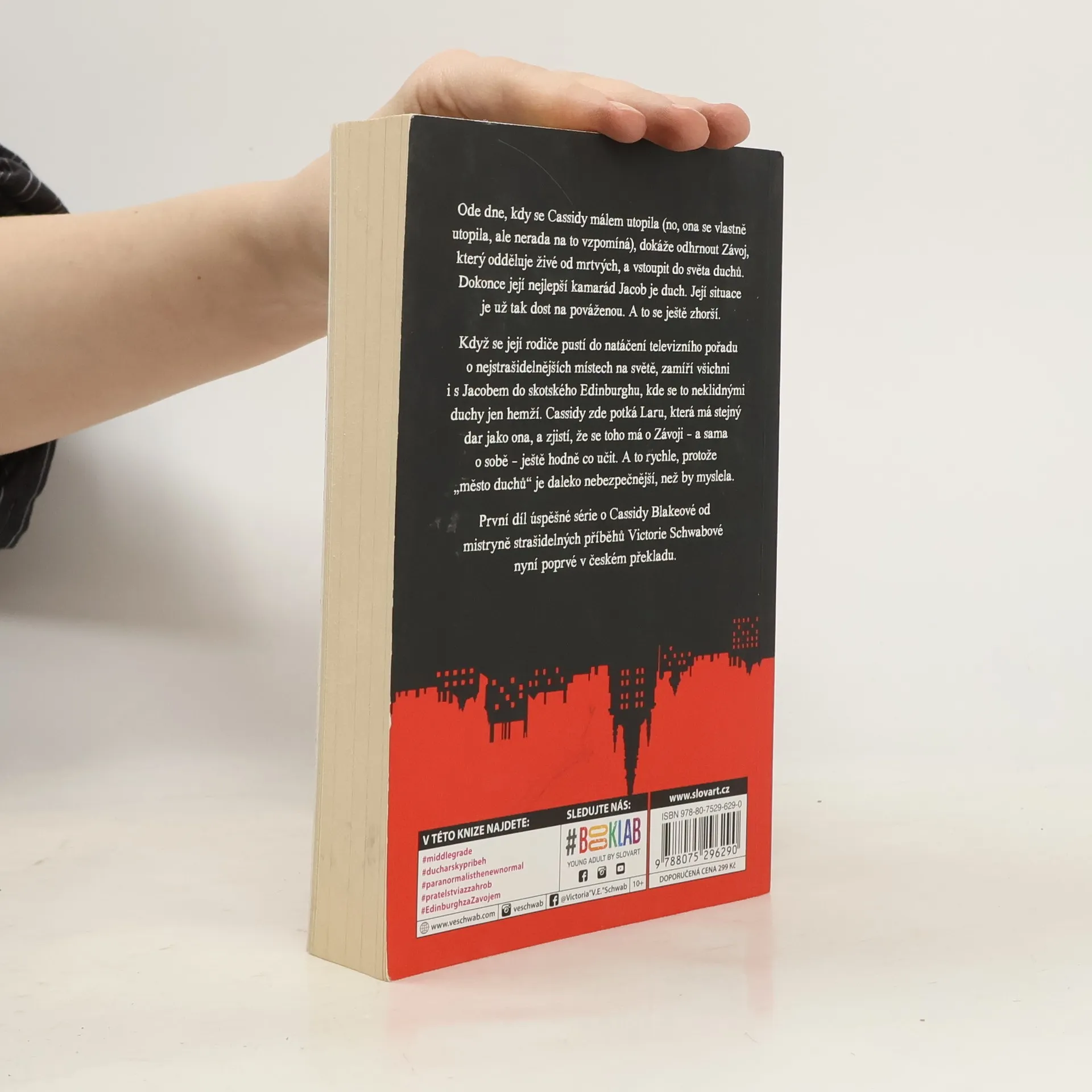 Od toho dne, co se Cassidy málem utopila (no, ona se vlastně utopila, ale nerada na to vzpomíná), dokáže odtáhnout Závoj, který odděluje živé od mrtvých... a vstoupit do světa duchů. Dokonce její nejlepší kamarád Jacob je duch. Už tak je její situace dost na pováženou. A to se ještě zhorší. Když se její rodiče pustí do natáčení televizního pořadu o nejstrašidelnějších místech na světě, zamíří všichni i s Jacobem do skotského Edinburghu, kde se místní hřbitovy, hrady a tajné uličky jen hemží neklidnými duchy. A tehdy Cassidy potká Laru, dívku, která má stejný dar jako ona, a zjistí, že se toho má o Závoji – a sama o sobě – ještě hodně co učit. A bude se muset učit rychle, protože Město duchů je daleko nebezpečnější, než by myslela. První díl úspěšné série Cassidy Blakeové od mistryně strašidelných příběhů Victorie Schwabová nyní poprvé v českém překladu.