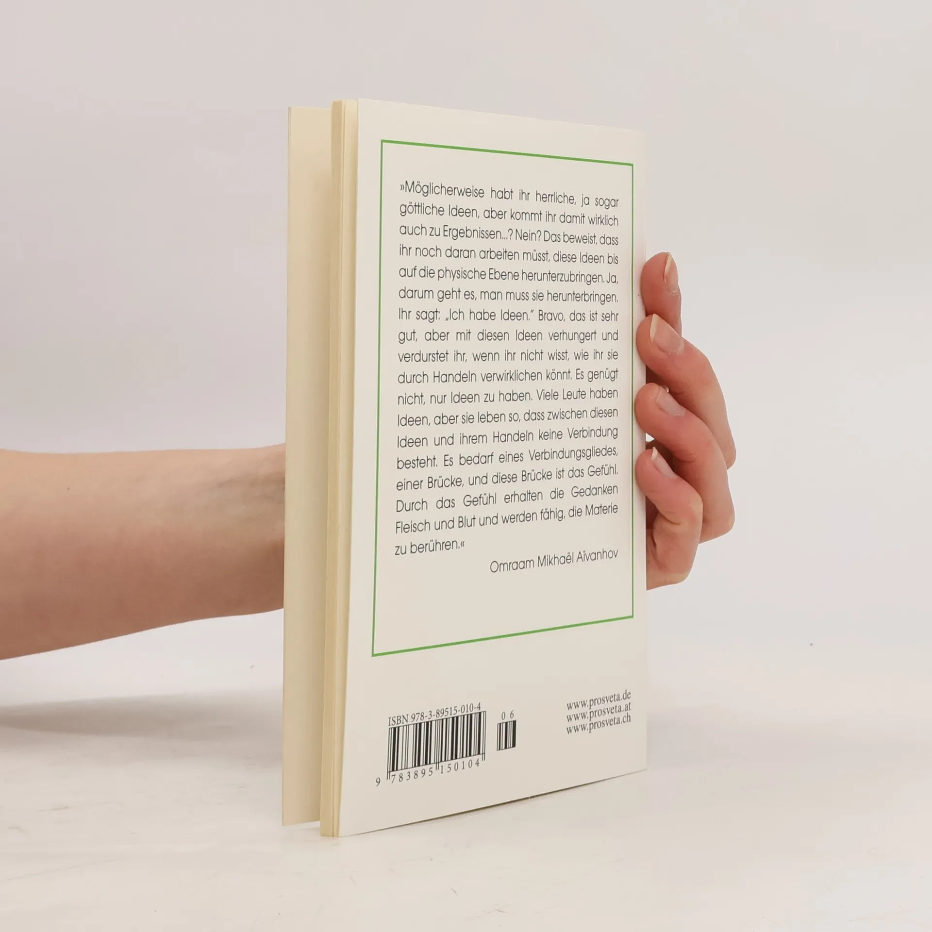 'Möglicherweise habt ihr herrliche, ja sogar göttliche Ideen, aber kommt ihr damit wirklich auch zu Ergebnissen?. Nein? Das beweist, d ihr noch daran arbeiten müsst, diese Ideen bis auf die physische Ebene herunterzubringen. Ja, darum geht es, man muss sie herunterbringen. Ihr 'Ich habe Ideen.' Bravo, das ist sehr gut, aber mit diesen Ideen verhungert und verdurstet ihr, wenn ihr nicht wisst, wie ihr sie durch Handeln verwirklichen könnt. Es genügt nicht, nur Ideen zu haben. Viele Leute haben Ideen, aber sie leben so, d zwischen diesen Ideen und ihrem Handeln keine Verbindung besteht. Es bedarf eines Verbindungsgliedes, einer Brücke, und diese Brücke ist das Gefühl. Durch das Gefühl erhalten die Gedanken Fleisch und Blut und werden fähig, die Materie zu berühren.' Omraam Mikhael Aivanhov
