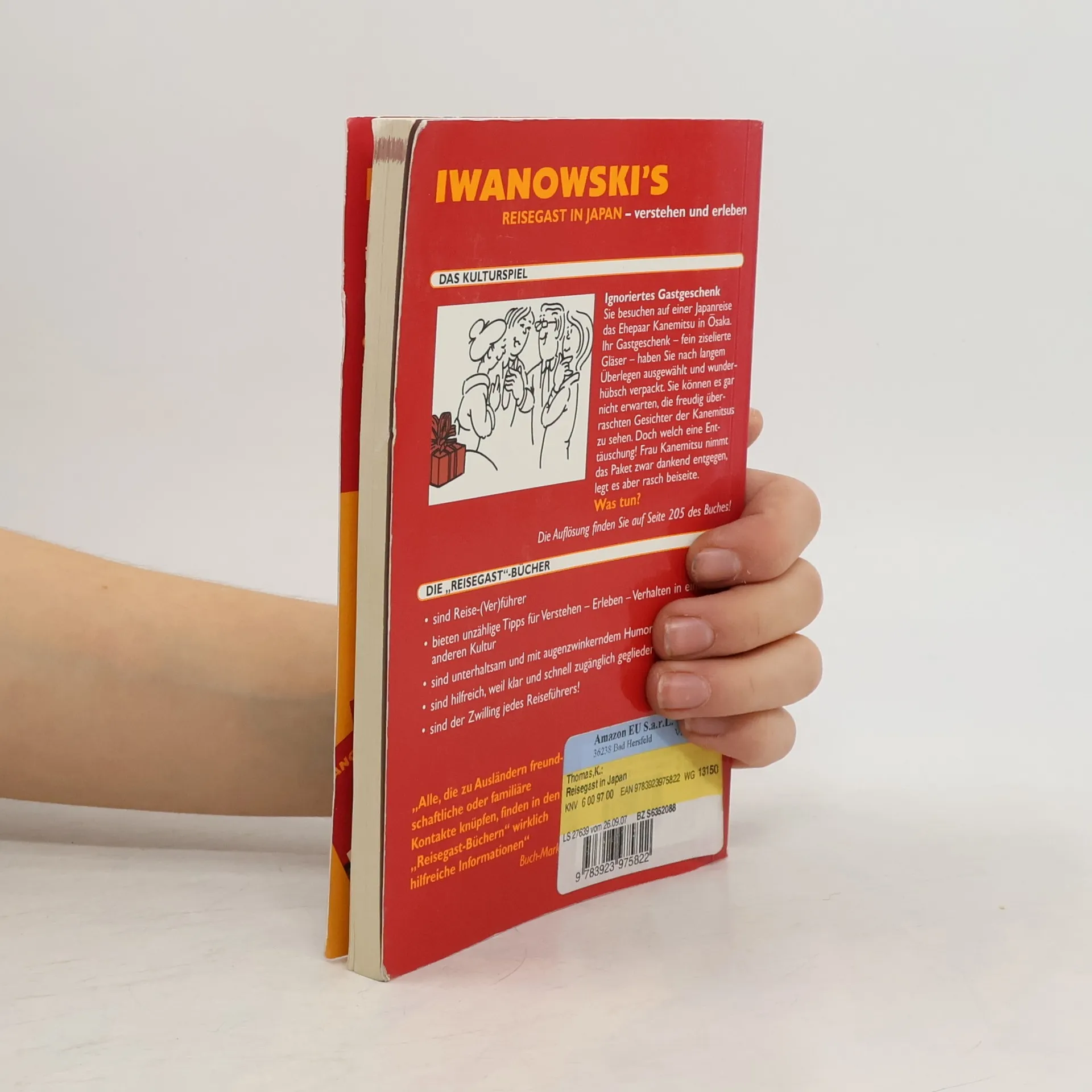 Das Kulturspiel: Ignoriertes Gastgeschenk Sie besuchen auf einer Japanreise das Ehepaar Kanemitsu in Osaka. Ihr Gastgeschenk - fein ziselierte Gläser - haben Sie nach langem Überlegen ausgewählt und wunderhübsch verpackt. Sie können es gar nicht erwarten, die freudig überraschten Gesichter der Kanemitsus zu sehen. Doch welch eine Enttäuschung! Frau Kanemitsu nimmt das Paket zwar dankend entgegen, legt es aber rasch beiseite. Was tun? a) Sie fordern Frau Kanemitsu offen und herzlich auf, das Paket doch endlich zu öffnen. Schließlich kennen Sie einander gut. b) Sie erzählen, wie viele Geschäfte Sie auf der Suche nach diesem Mitbringsel durchforstet haben, um so - als Wink mit dem Zaunpfahl - das Auspacken zu provozieren. c) Sie drücken Ihre Enttäuschung weg und hoffen, das sich Frau Kanemitsu später bedankt. Die Lösung finden Sie auf Seite 205 des Buches. Das Besondere dieses Buches: Kultur- und Geschäftsreisende in Japan benötigen „Starthilfen“, um nicht in ein Fettnäpfchen zu treten. Wirkliche persönliche Kontakte sind nur möglich, wenn man bestimmte kulturelle Eigenarten berücksichtigt. Der „Reisegast“ vertieft diese Eigenarten und beschreibt humorvoll und mit einem Augenzwinkern die Besonderheiten des Aufenthalts in Japan.