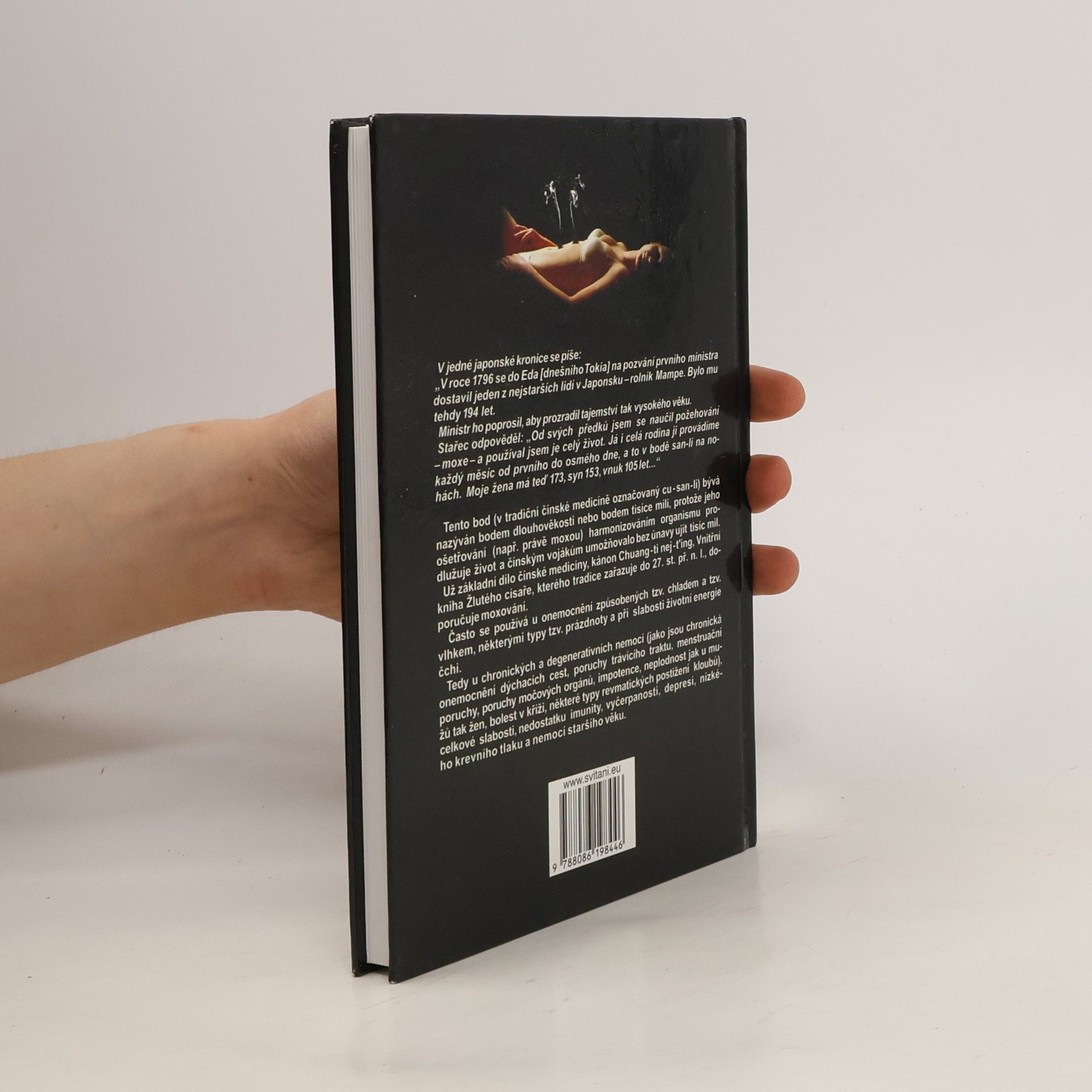 Kniha popisuje metodu tzv. požehování (moxe) jako prostředku pro dosažení dlouhověkosti v bodě cu-san-li.Moxování se používá často u onemocnění způsobených tzv.chladem a tzv.vlhkem, některými typy tzv. prázdnoty a při slabosti životní energie čchi (tj. chronická a degerativní onemocnění dýchacích cest, poruchy trávícího traktu, menstruační poruchy, revma, deprese apod.)