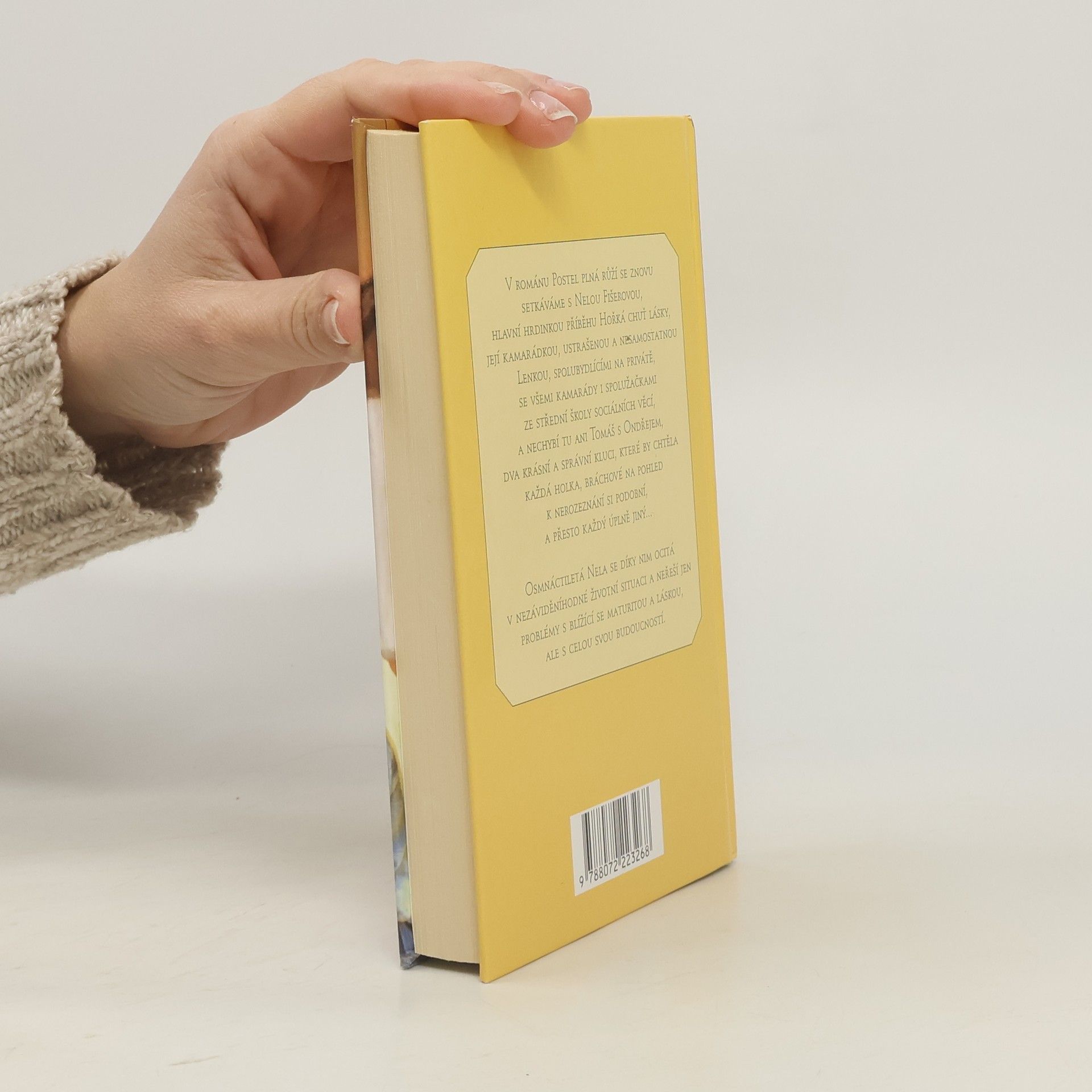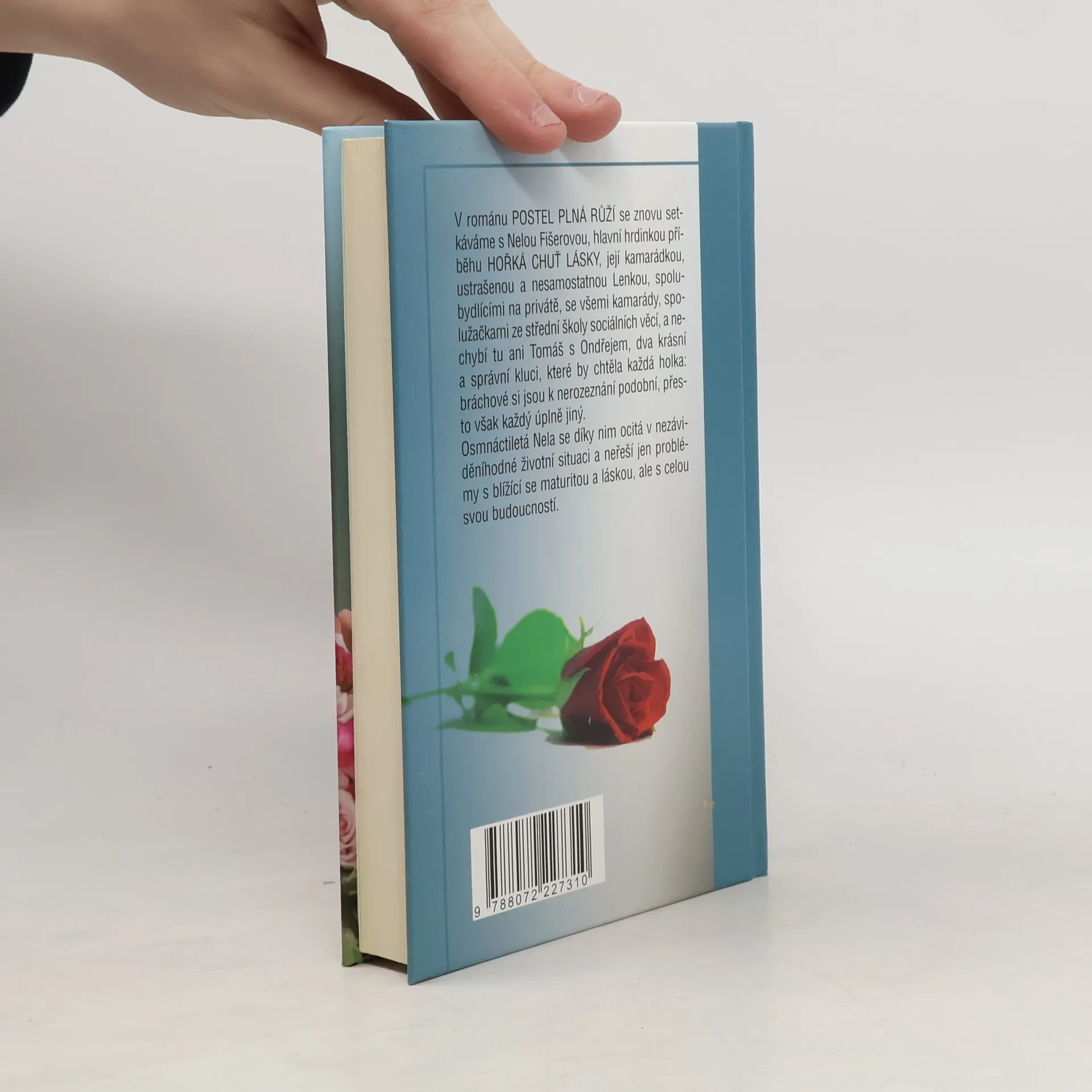V románu POSTEL PLNÁ RŮŽÍ se znovu setkáváme s Nelou Fišerovou,hlavní hrdinkou příběhu HOŘKÁ CHUŤ LÁSKY, její kamarádkou, ustrašenoua nesamostatnou Lenkou, spolubydlícími na privátě, se všemi kamarády spolužačkami ze střední školy sociálních věcí, a nechybí tu ani Tomáš s Ondřejem, dva krásní a správní kluci, které by chtěla každá holka, bráchové na pohled k nerozeznání si podobní a přesto každý úplně jiný. Osmnáctiletá Nela se díky nim ocitá v nezáviděníhodné životní situaci a neřeší jen problémy s blížící se maturitou a láskou, ale s celou svou budoucností.