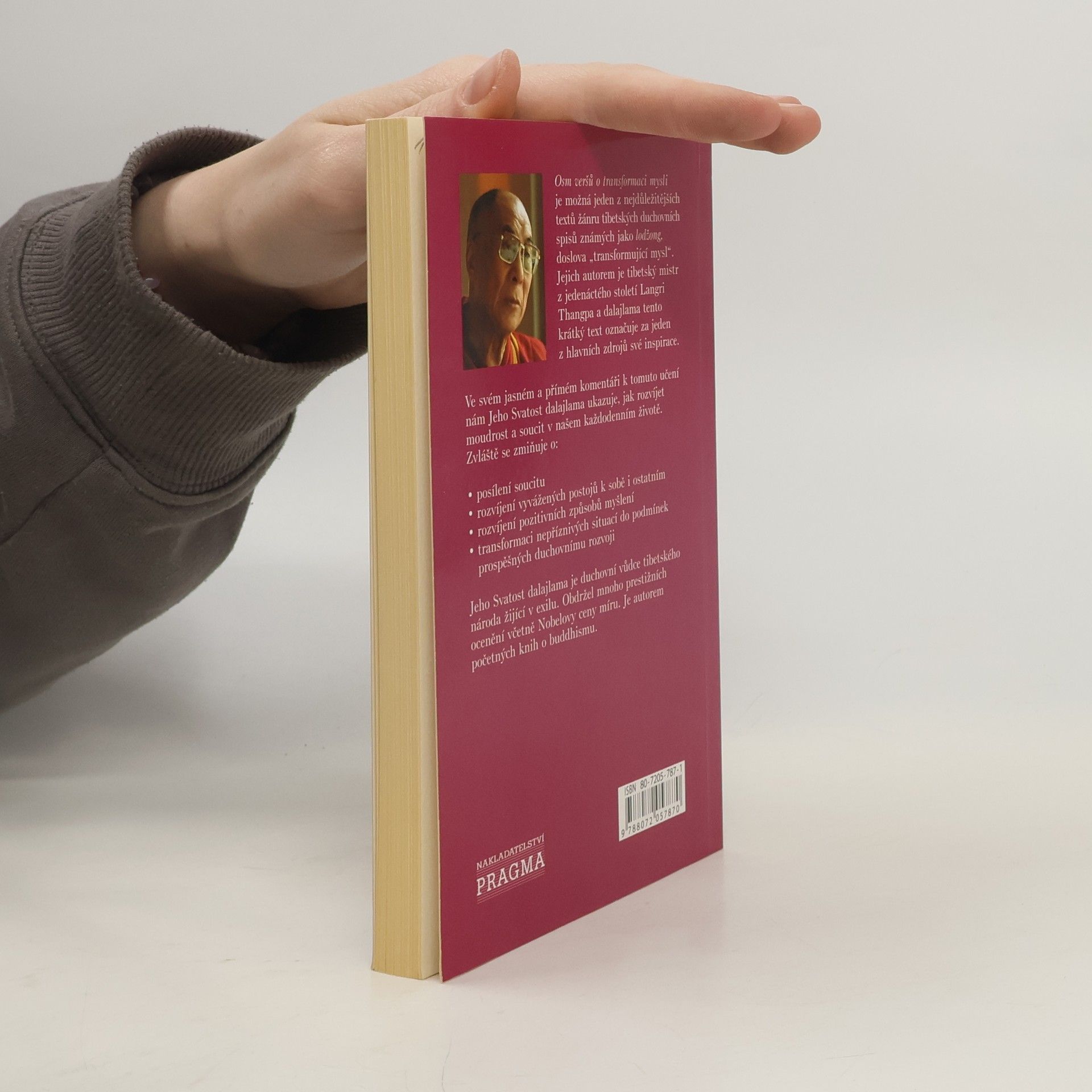 Osm veršů o vyvíjení a transformaci vašeho života. Jeden z nejdůležitějších textů žánru tibetských duchovních spisů známých jako lodžong. Jejich autorem je tibetský mistr z jedenáctého století Langri Thangpa a dalajlama tento krátký text označuje za jeden z hlavních zdrojů své inspirace. Ve svém jasném a přímém komentáři k tomuto učení nám Jeho Svatost dalajlama ukazuje, jak rozvíjet moudrost a soucit v každodenním životě.