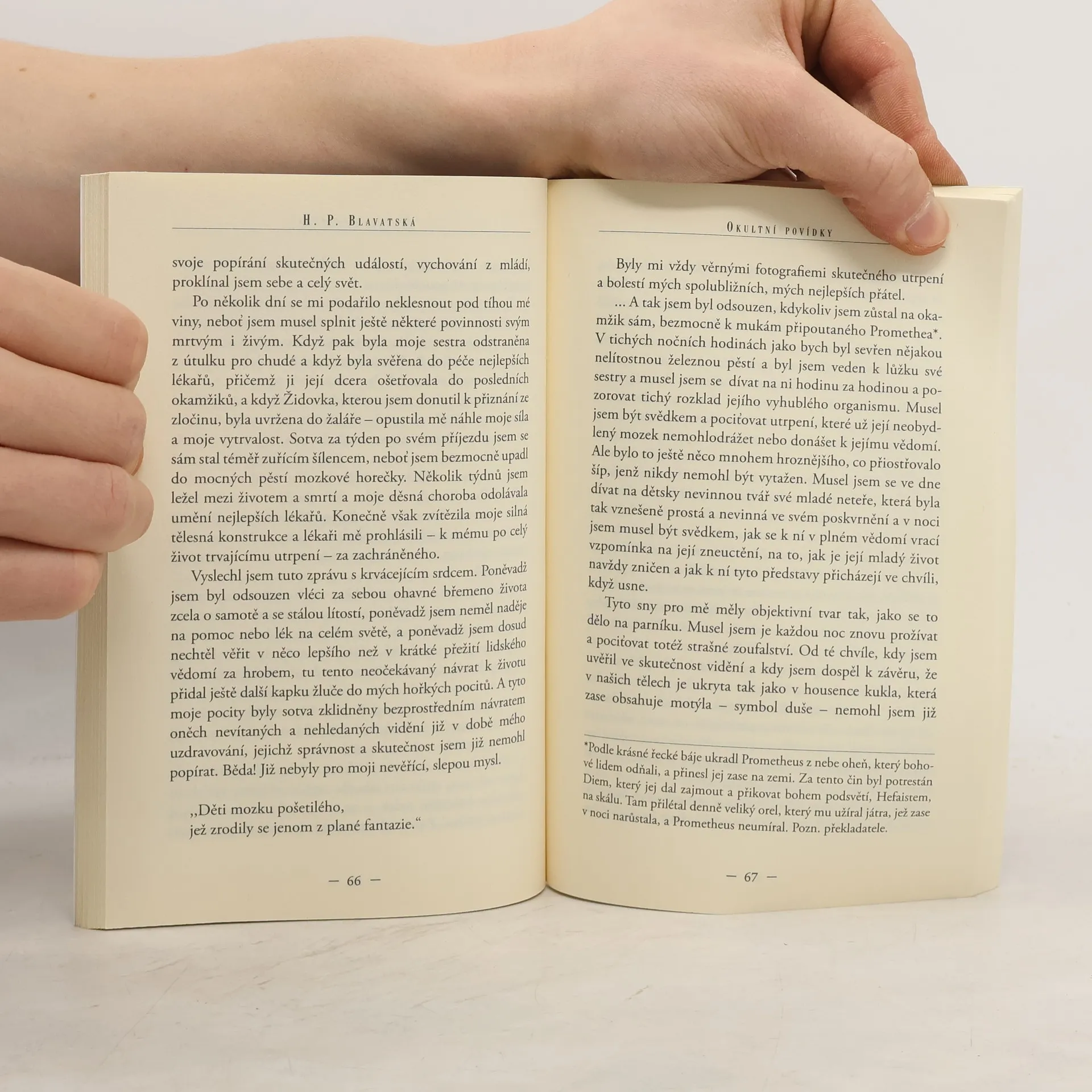 Helena Petrovna Blatavská (1831-1891) byla významná osobnost duchovního života poloviny 19.století a zakladatelka Theosofické společnosti. Věnovala se okultismu, její okolí ji uznávalo pro údajné nadpřirozené schopnosti. Okultní povídky jsou beletrizovanou, odlehčenou formou jejího vnímání světa. Poprvé vyšly v roce 1924 a obsahují příběhy plné tajemna, napětí, překvapení a mrazivého chvění.