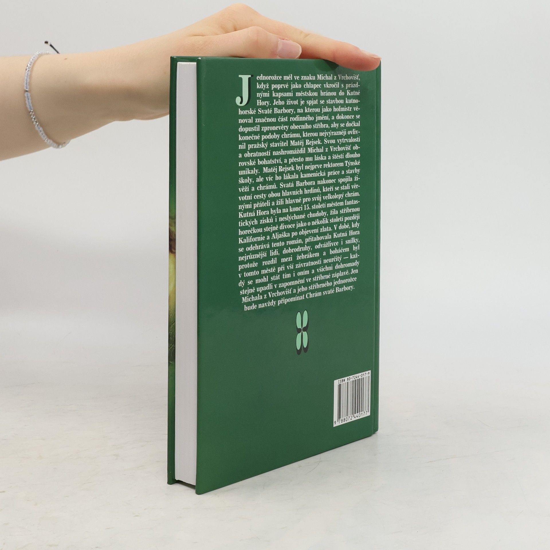 Jednorožce měl ve znaku Michal z Vrchovišť, když poprvé jako chlapec vkročil s prázdnými kapsami městskou bránou do Kutné Hory. Jeho život je spjat se stavbou kutnohorské Svaté Barbory, na kterou jako hofmistr věnoval značnou část rodinného jmění, a dokonce se dopustil zpronevěry obecního stříbra, aby se dočkal konečné podoby chrámu, kterou nejvýrazněji ovlivnil pražský stavitel Matěj Rejsek. Svou vytrvalostí a obratností nashromáždil Michal z Vrchovišť obrovské bohatství, a přesto mu láska a štěstí dlouho unikaly. Matěj Rejsek byl nejprve rektorem Týnské školy, ale víc ho lákala kamenická práce a stavby věží a chrámů. Svatá Barbora nakonec spojila životní cesty obou hlavních hrdinů, kteří se stali věrnými přáteli a žili hlavně pro svůj velkolepý chrám. Kutná Hora byla na konci 15. století městem fantastických zisků i neslýchané chudoby, žila stříbrnou horečkou stejně divoce jako o několik století později Kalifornie a Aljaška po objevení zlata. V době, kdy se odehrává tento román, přitahovala Kutná Hora nejrůznější lidi, dobrodruhy, odvážlivce i snílky, protože rozdíl mezi žebrákem a boháčem byl v tomto městě při vší závratnosti neurčitý - každý se mohl stát tím i oním a všichni dohromady stejně upadli v zapomnění ve stříbrné záplavě. Jen Michala z Vrchovišť a jeho stříbrného jednorožce bude navždy připomínat Chrám svaté Barbory.
