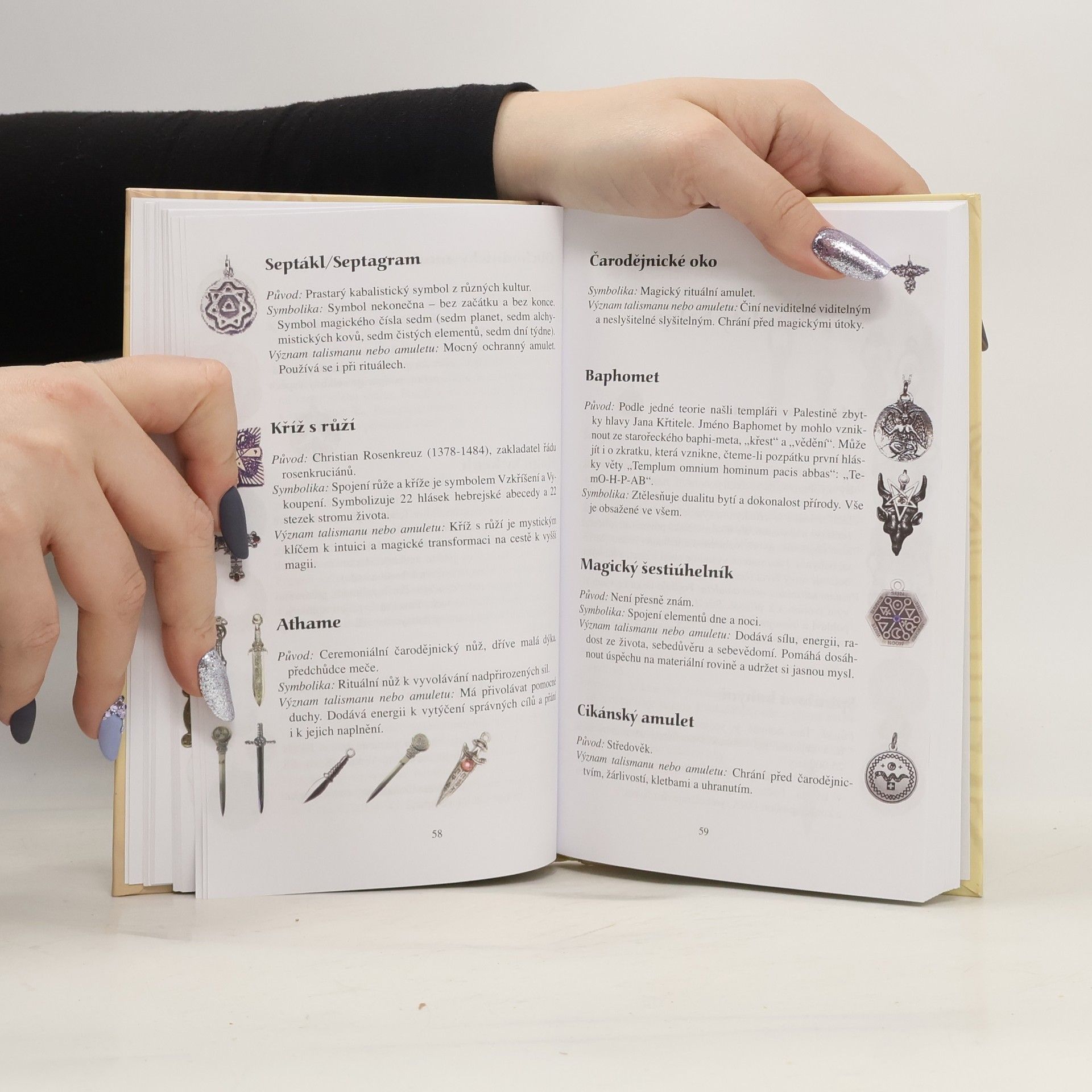 Obrazová encyklopedie symbolů křesťanství, buddhismu a dalších náboženství i národů (např. Keltové) s jejich výkladem a vyobrazením. Obrázky talismanů s výkladem jejich významu jsou řazeny podle náboženství a kultů. Připojen slovníček kultovních významů symbolů a abecední rejstřík.