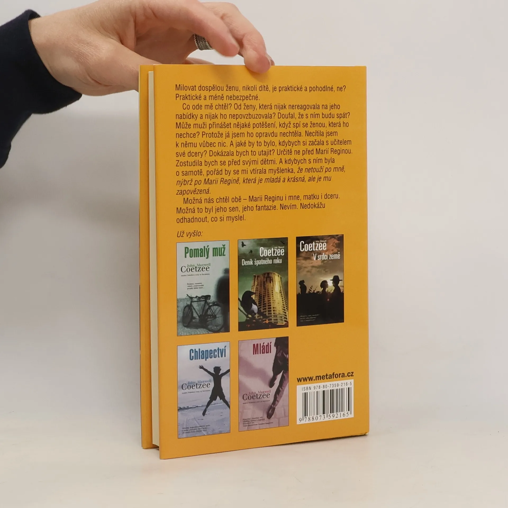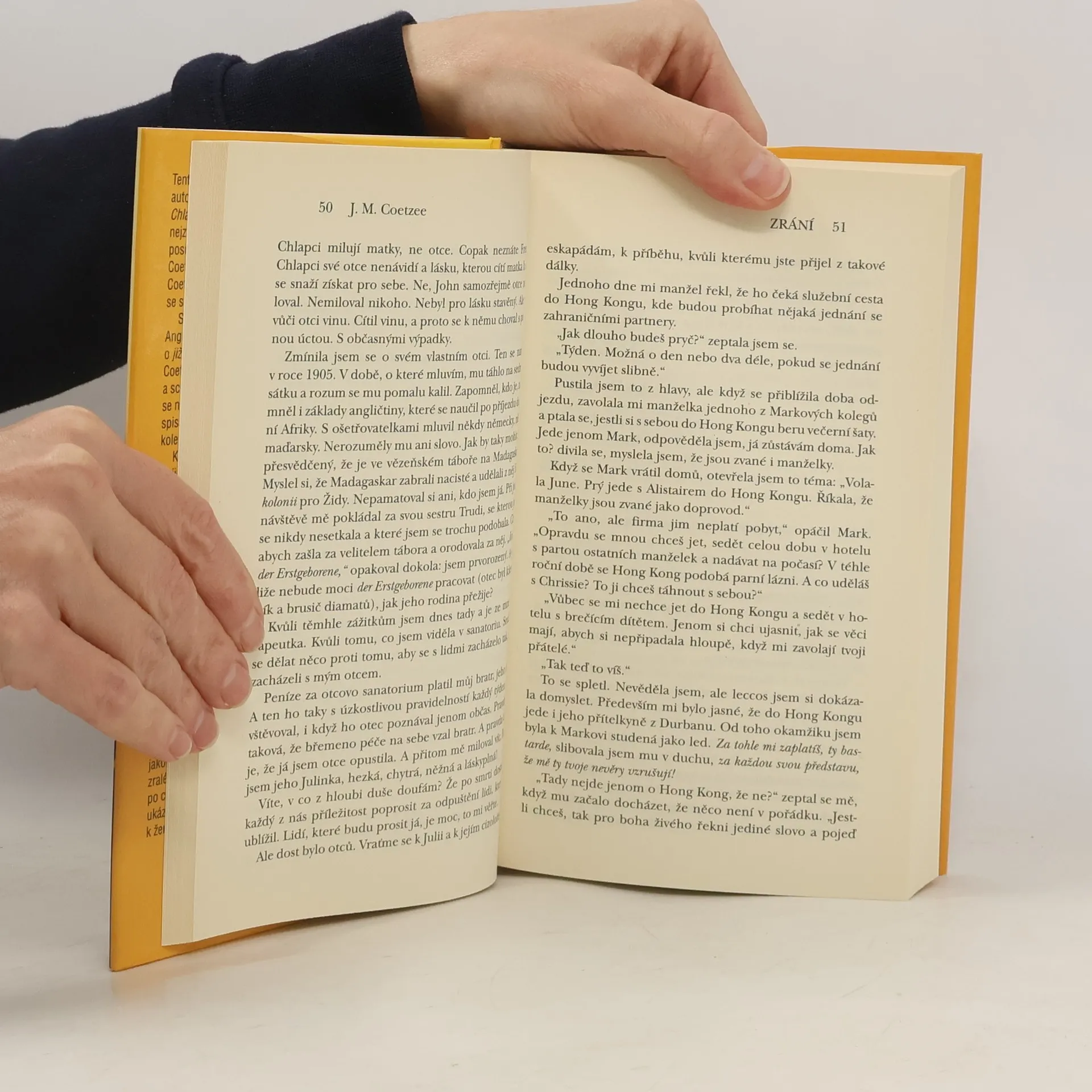 Autobiografie, kterou její autor nikdy nenapsal, a vzpomínky na zemřelého, který stále ještě žije… Román Zrání uzavírá Coetzeeho třídílnou fiktivní autobiografii, a navazuje tak na knihy Chlapectví a Mládí. Svorníkem příběhu je mladý Angličan Vincent, který připravuje knihu o již zemřelém autorovi Johnu Maxwellu Coetzeem a schází se kvůli ní s pěticí lidí, jejichž životy se nějakým způsobem protnuly s životem tohoto spisovatele a z nichž každý z nich ho vidí jinýma očima. Pandán k těmto vzpomínkám tvoří Coetzeeho poznámky k chystané autobiografii, kterou ovšem nikdy nenapsal. Zrání je silná próza, již Coetzee prokládá drsným sebezničujícím humorem; a také něžná, jímavá knížka o podobách lásky a o vztahu zralého muže k otci.