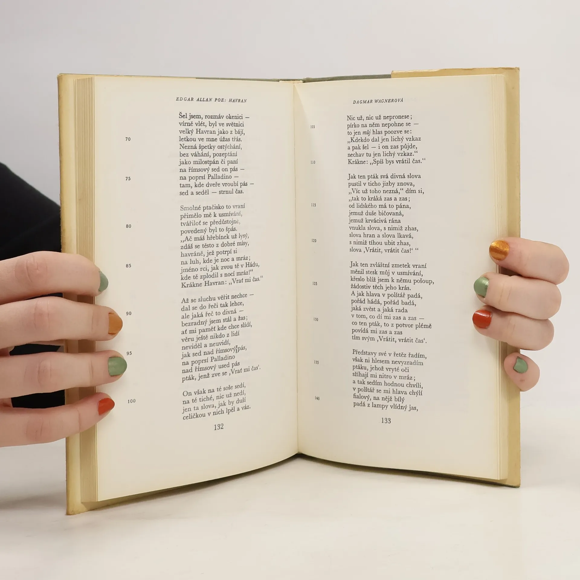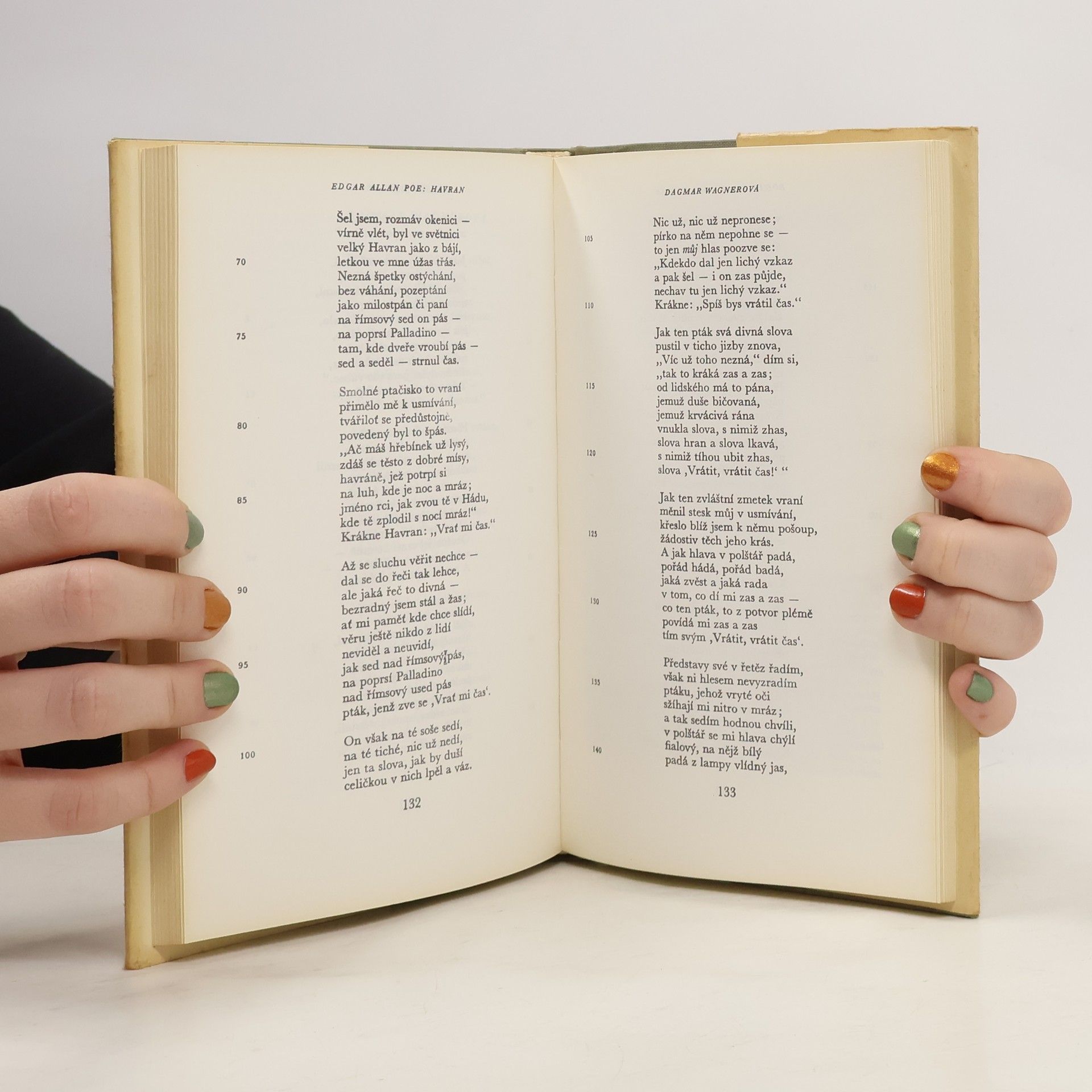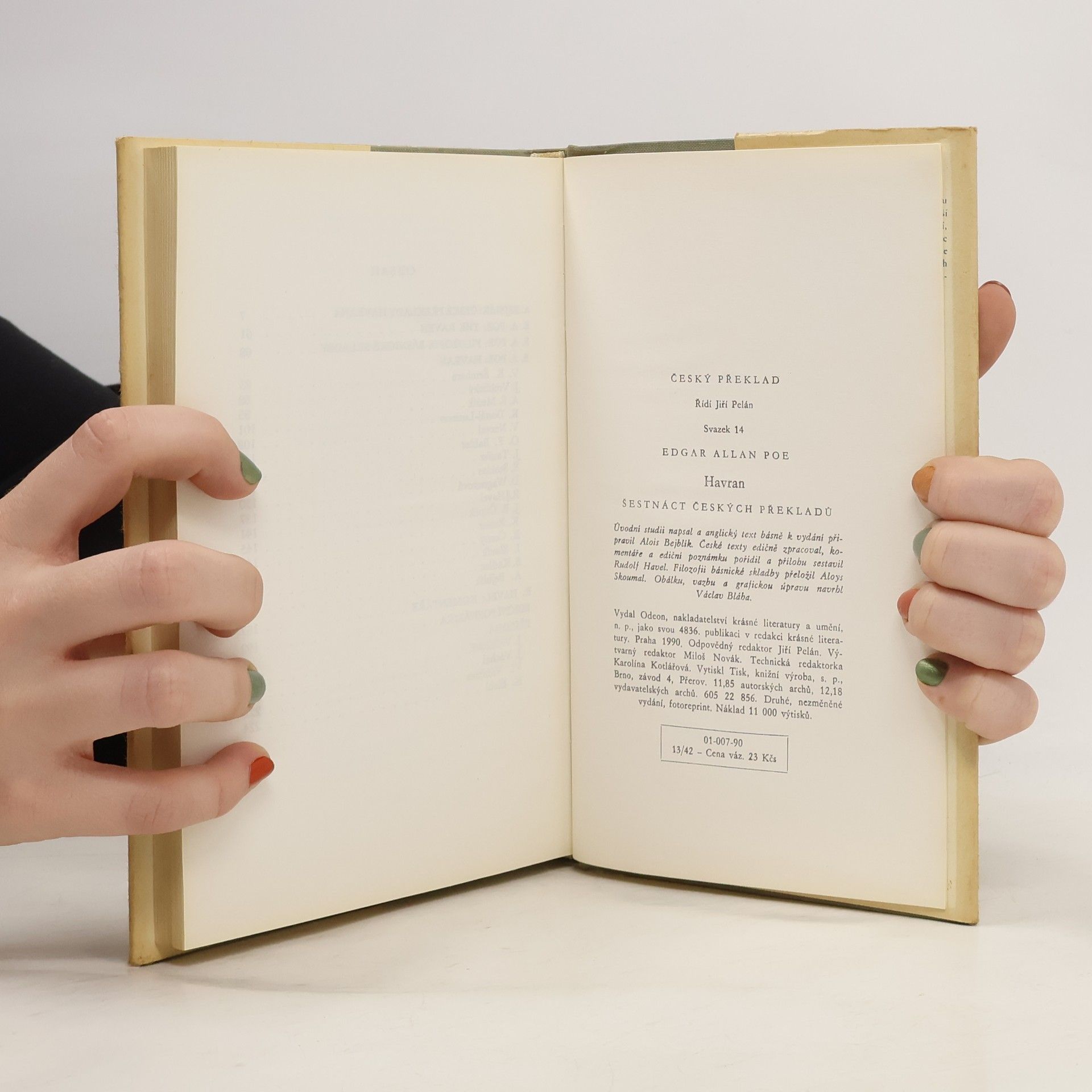 Šestnáct českých překladů. Kniha obsahuje úvodní studii A. Bejblíka, originál básně The Raven, Poeovu Filozofii básnické skladby, šestnáct českých překladů Havrana a přílohu s různými parafrázemi Havrana (J. Vrchlický, J. Váchal, V. Vančura, K. Biebl). České texty edičně zpracoval, komentáře a ediční poznámku pořídil a přílohu sestavil Rudolf Havel. Filozofii básnické skladby přeložil Aloys Skoumal. Částečně anglický text. Obsahuje překlady: Vratislav Kazimír Šembera (1869) Jaroslav Vrchlický (1881) Augustin Eugen Mužík (1885) Karel Dostál-Lutinov (1918) Vítězslav Nezval (1928) Otto František Babler (1930) Jiří Taufer (1938) Eugen Stoklas (1939) Dagmar Wagnerová (1945) Rudolf Havel (1946) Jan Blahoslav Čapek (1947) Kamill Resler (1948) Rudolf Černý (1952) Ivan Slavík (1953) Svatopluk Kadlec (1964) Alois Bejblík (1984)... celý text