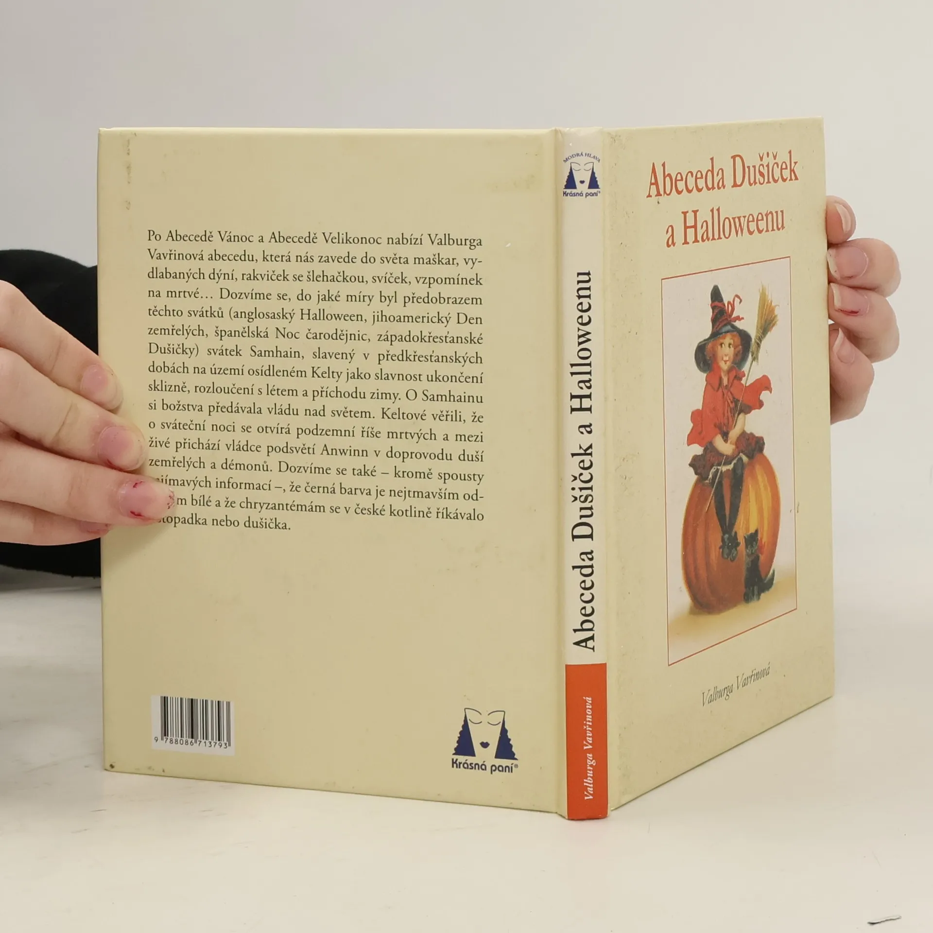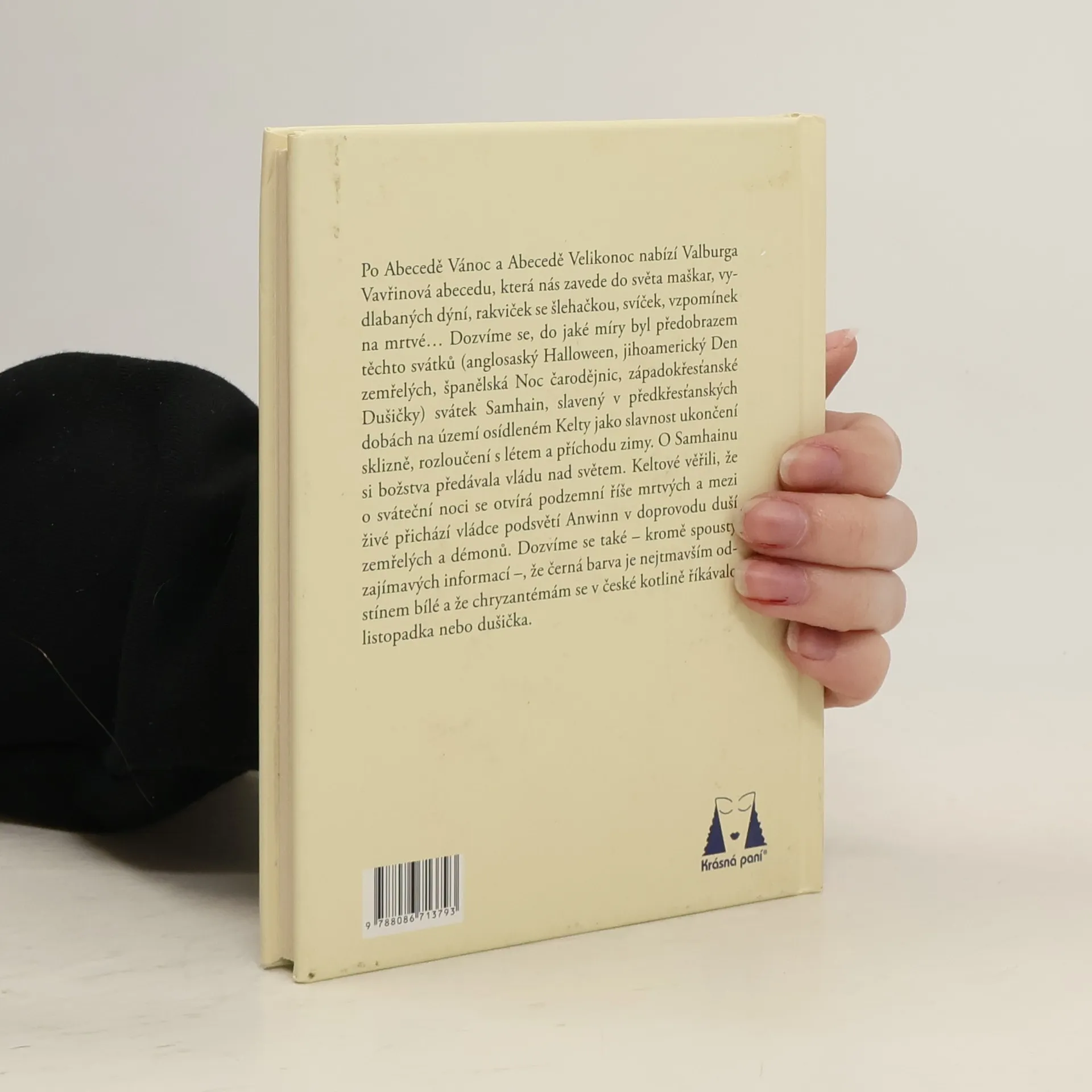 Po Abecedě Vánoc a Abecedě Velikonoc nabízí naše autorka Abecedu, která nás zavede do světa maškar, vydlabaných dýní, rakviček se šlehačkou, svíček, vzpomínek na mrtvé, smutku i veselí… Dozvíme se, do jaké míry byl předobrazem těchto svátků (anglosaský Halloween, jihoamerický Den zemřelých, španělská Noc čarodějnic, západokřesťanské Dušičky) svátek Samhain, který byl slaven v předkřesťanských dobách na území, osídleném Kelty. Dozvíme se také – krom spousty zajímavých informací –, že černá barva je nejtmavším odstínem bílé a že chryzantémám se v českých zemích říkalo listopadka nebo dušička.