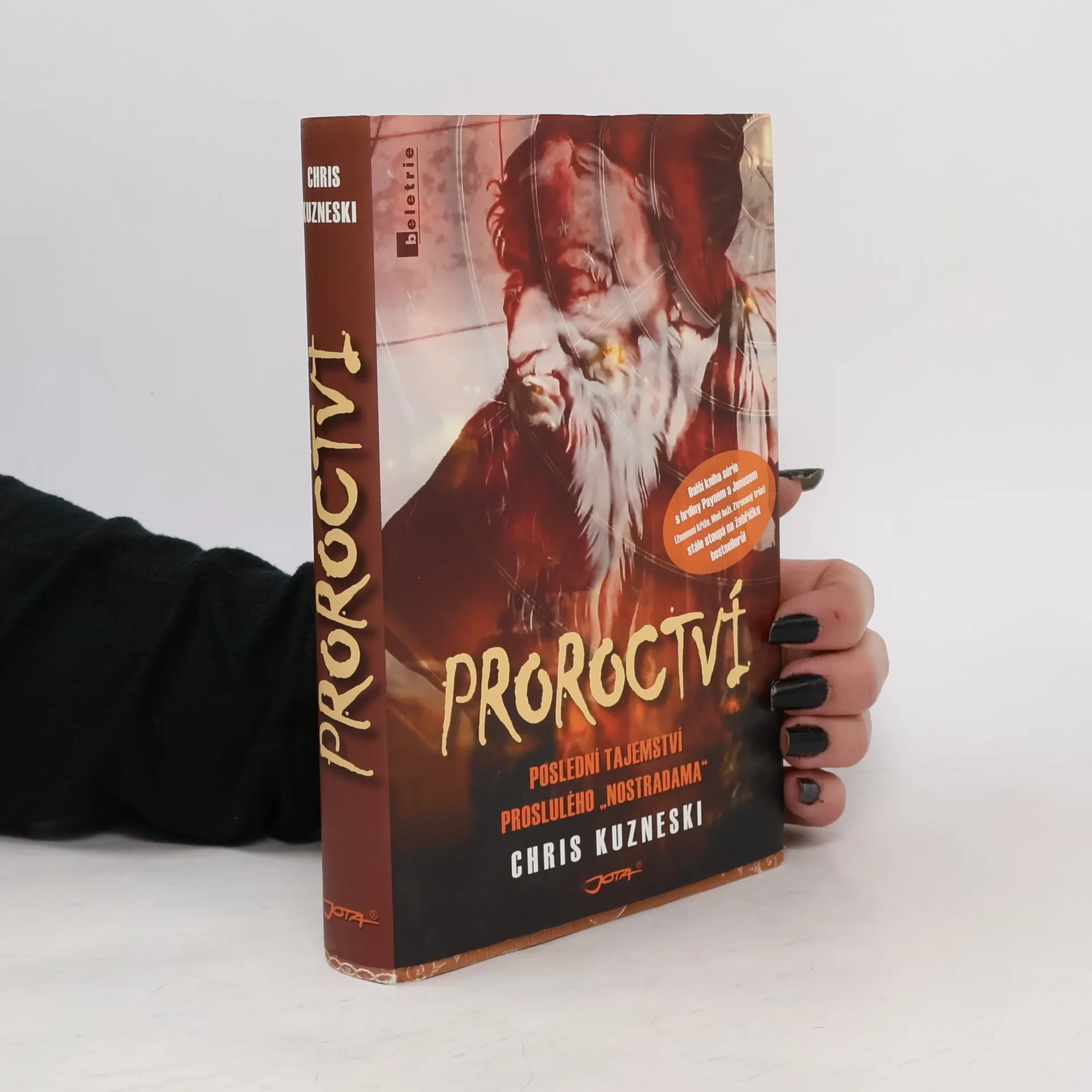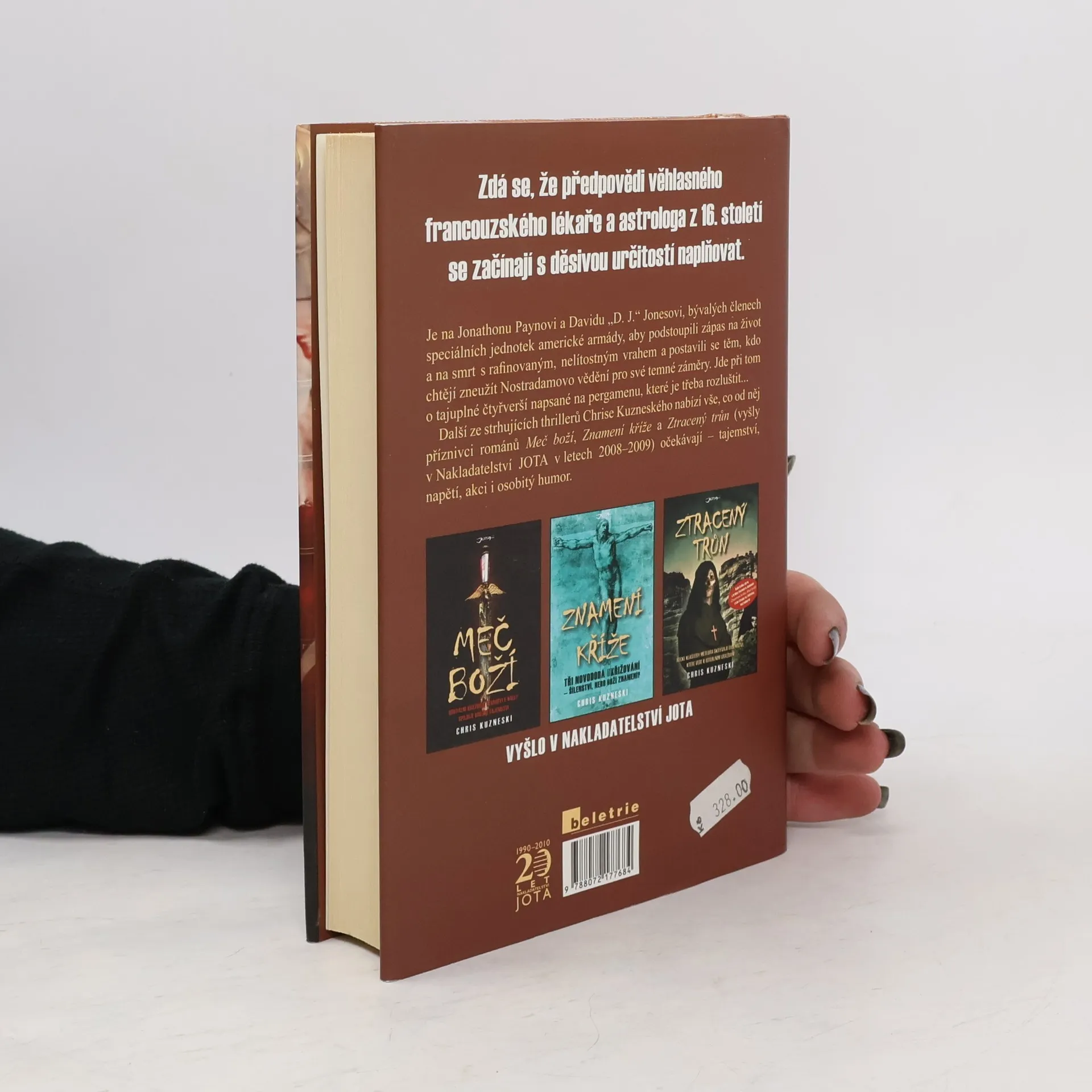 Jako by se předpovědi věhlasného francouzského lékaře a astrologa začínaly s děsivou přesností naplňovat! Je na Jonathonu Payneovi a Davidu „D. J.“ Jonesovi, bývalých členech speciálních jednotek americké armády, aby podstoupili zápas na život a na smrt s rafinovaným a nelítostným vrahem a postavili se těm, kdo chtějí zneužít Nostradamovo vědění pro své temné záměry. Hraje se o tajuplné čtyřverší napsané na pergamenu, které je třeba rozluštit… Další ze strhujících thrillerů Chrise Kuzneského nabízí vše, co od něj příznivci románů Meč boží, Znamení kříže a Ztracený trůn očekávají — tajemství, napětí, akci i osobitý humor.