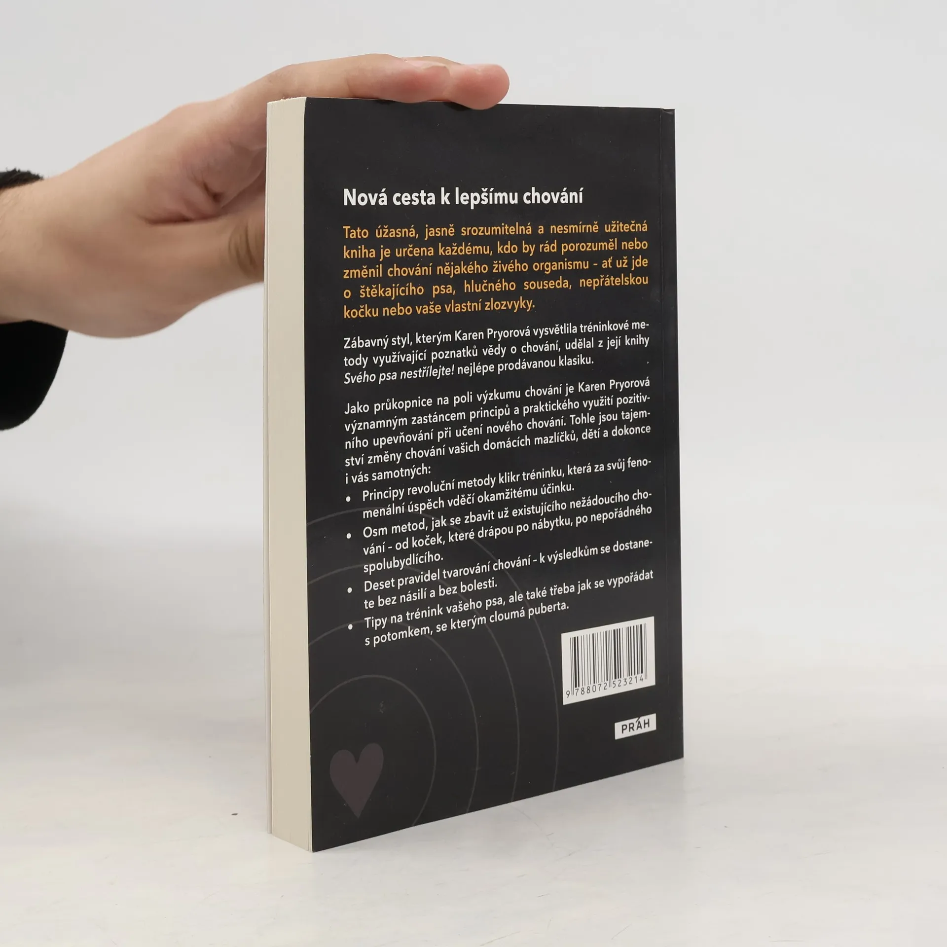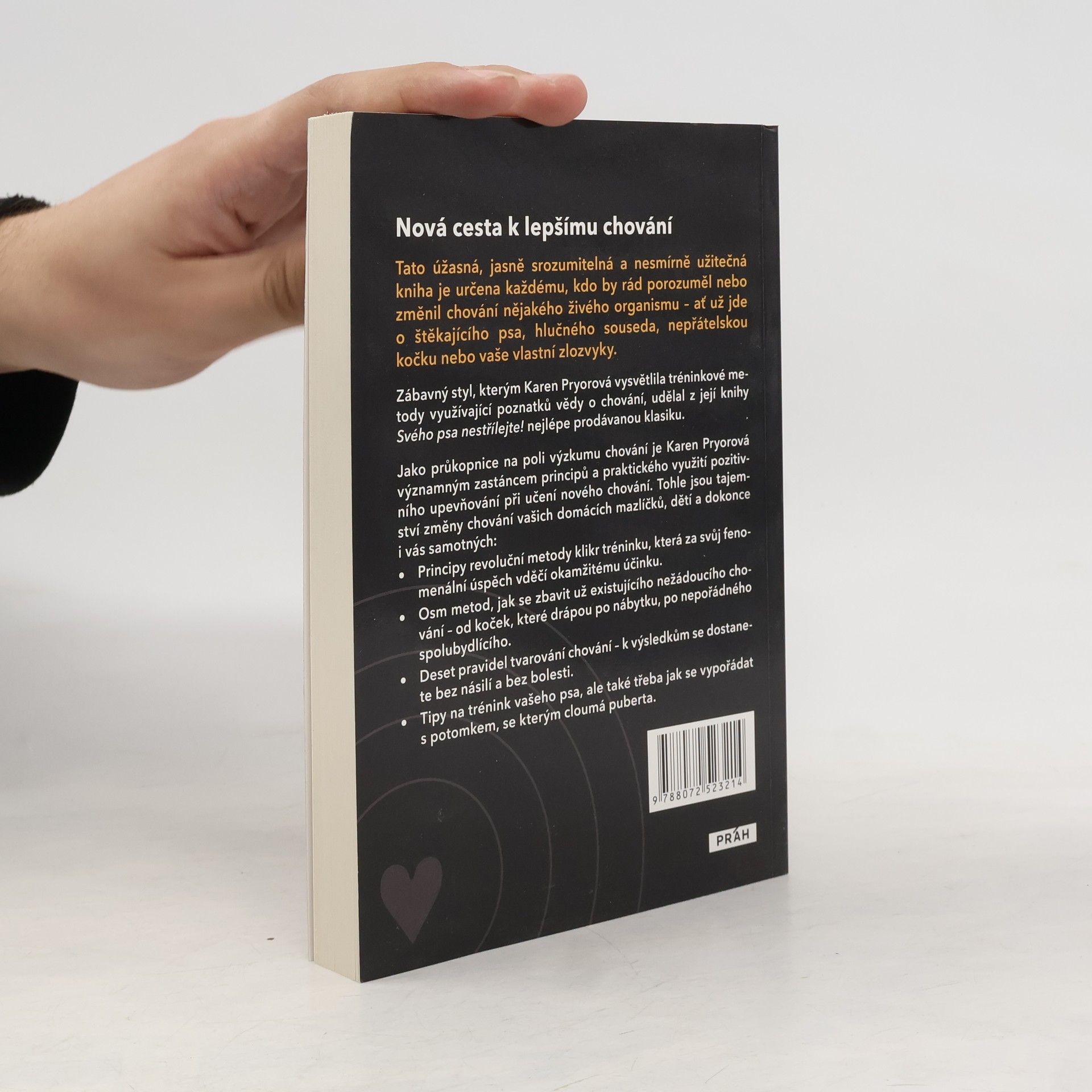 Zakladatelka klikr tréninku Karen Pryorová napsala knihu Svého psa nestřílejte!, která přináší zcela nový přístup k učení a trénování psa, ale nejen jeho. Tato úžasná, jasně srozumitelná a nesmírně užitečná kniha je určena každému, kdo by rád porozuměl nebo změnil chování nějakého živého organismu - ať už jde o štěkajícího psa, hlučného souseda, nepřátelskou kočku nebo vaše vlastní zlozvyky. Světově uznávaná klasika Jako průkopnice na poli výzkumu chování je Karen Pryorová významným zastáncem principů a praktického využití pozitivního upevňování při učení nového chování. Tohle jsou tajemství změny chování vašich domácích mazlíčků, dětí a dokonce i vás samotných: Principy revoluční metody klikr tréninku, která za svůj fenomenální úspěch vděčí okamžitému účinku. Osm metod, jak se zbavit už existujícího nežádoucího chování - od koček, které drápou po nábytku, po nepořádného spolubydlícího. Deset pravidel tvarování chování - k výsledkům se dostanete bez násilí a bez bolesti. Tipy na trénink vašeho psa, ale také třeba jak se vypořádat s potomkem, se kterým cloumá puberta.