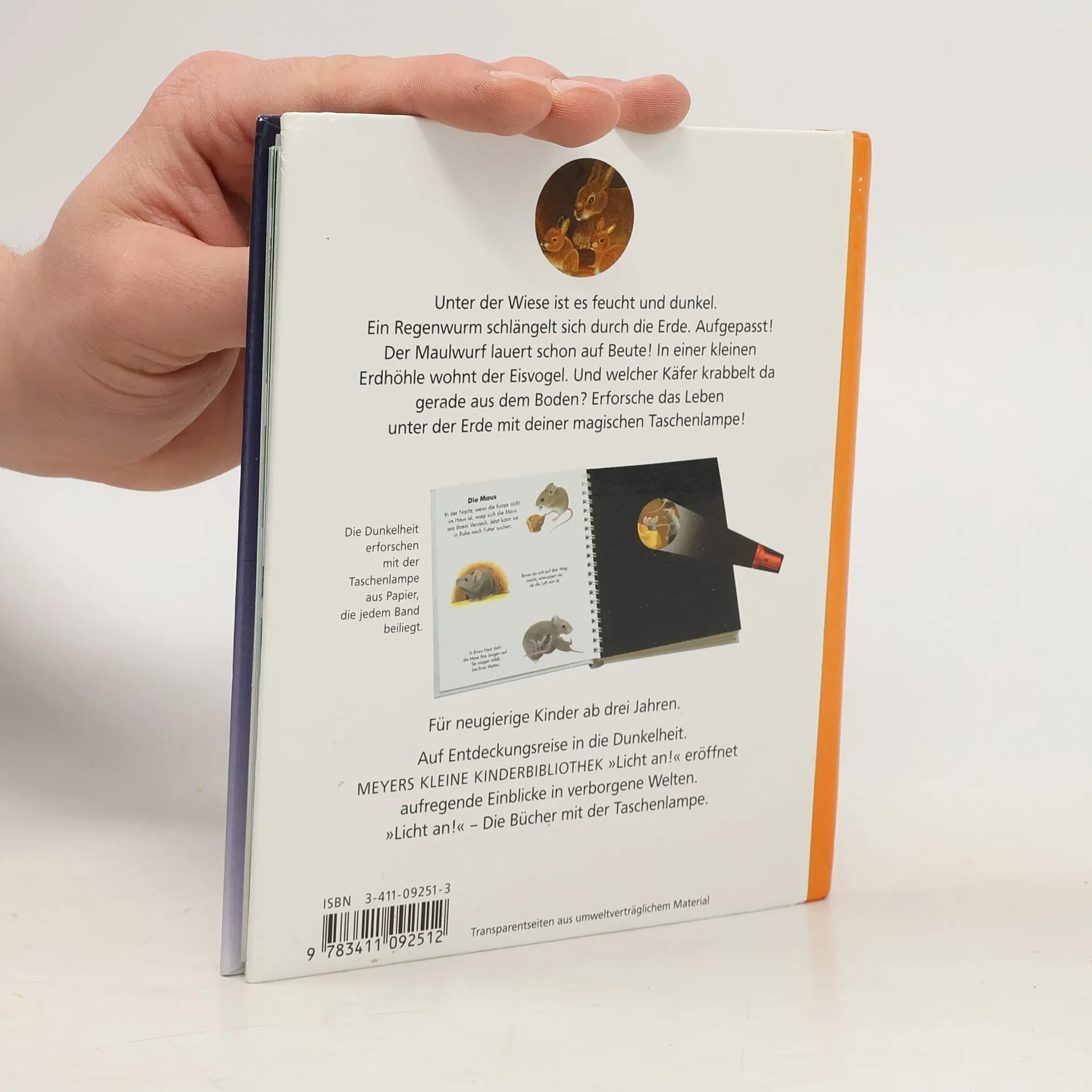 In der spannenden Sachbilderbuchreihe „Meyers kleine Kinderbibliothek – Licht an!“ entdecken kleine Forscher, was normalerweise im Dunkeln liegt. Mit der beiliegenden „Taschenlampe“ aus Papier können Kinder ab 4 Jahren unter den Entdeckerfolien gezielt bunte Szenen „beleuchten“ und in verborgene Welten eintauchen. In diesem Band lernen Kinder spielerisch, welche Tiere unter der Erde leben, von was sie sich ernähren, wie ein Kaninchenbau oder die unterirdischen Tunnelgänge des Maulwurfs von innen aussehen, wie der Biber seine Wasserburg baut oder welche Tiere sich Höhlen und Nester bauen.