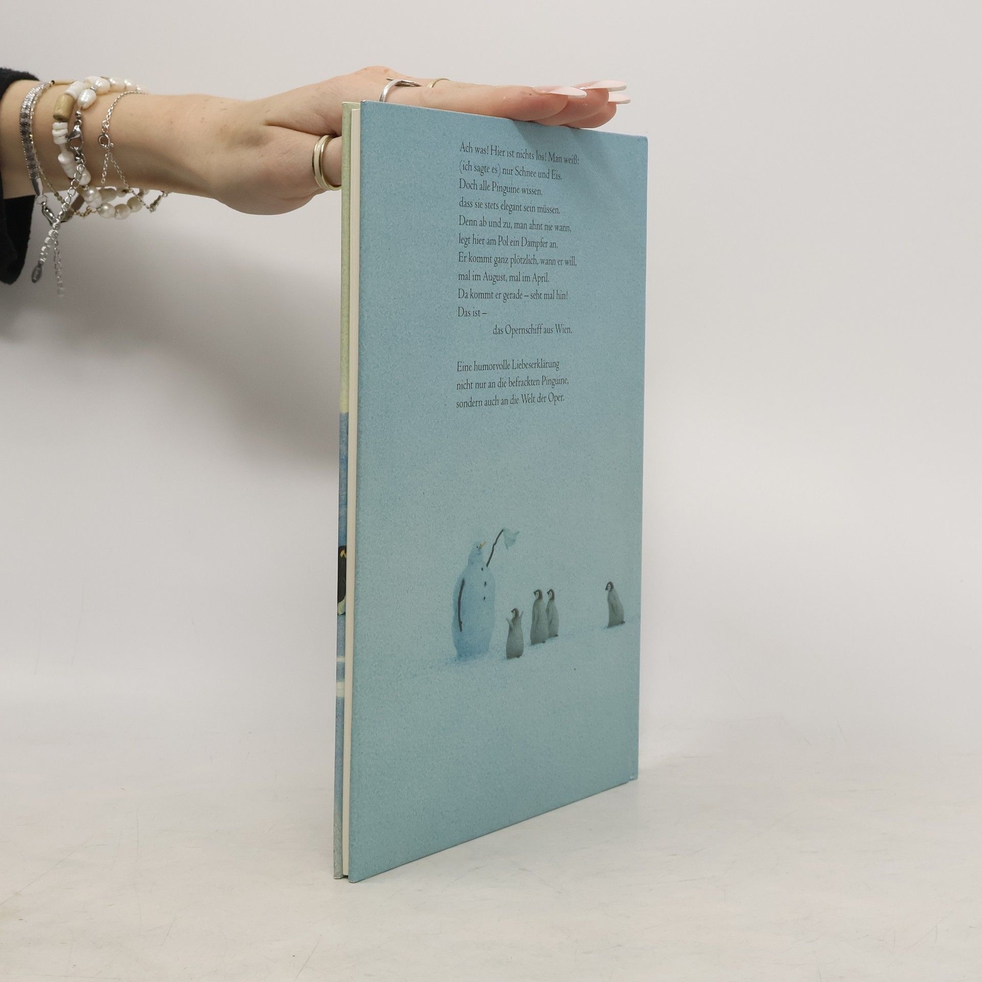 Am Südpol stehen sich die Pinguine die Beine in den Bauch. Geduldig harren sie der Dinge, die da kommen werden, und sie sind immer perfekt im Frack. Worauf sie warten? Elke Heidenreich hat es Gott sei Dank herausgefunden: Nicht allzu oft, doch dann und wann, kommt das Opernschiff aus Wien und lädt die Pinguine zur großen Operngala an Bord. Für diesen Tag wollen sie jederzeit gerüstet sein. Was diesmal wohl gespielt wird? Wer dieses Mal wohl singt? Man glaubt es kaum, die drei Tenöre. Und wenn sie »La Traviata« trällern, wird selbst den unterkühlten Pinguinen ganz heiß - aber auch nach der Vorstellung stehen sie so adrett da wie immer!
