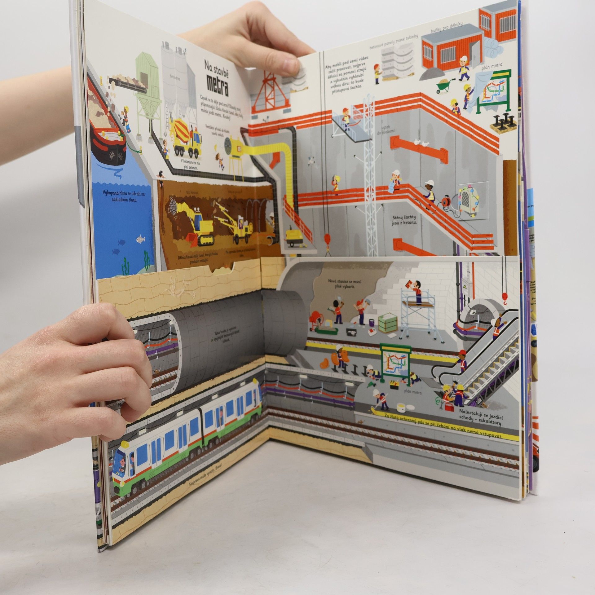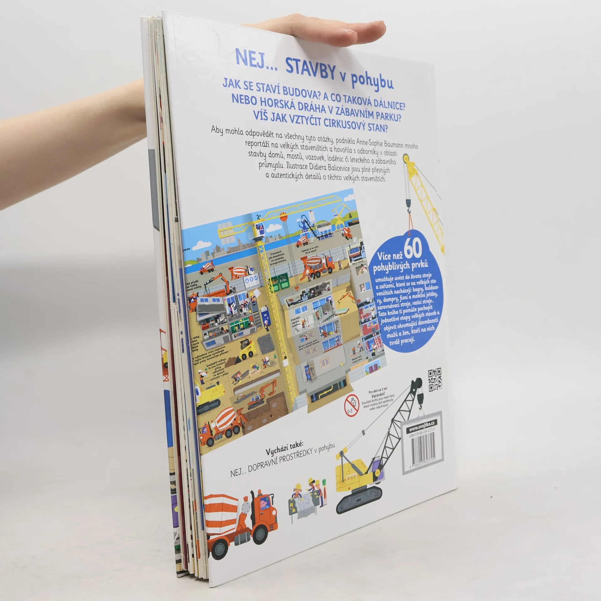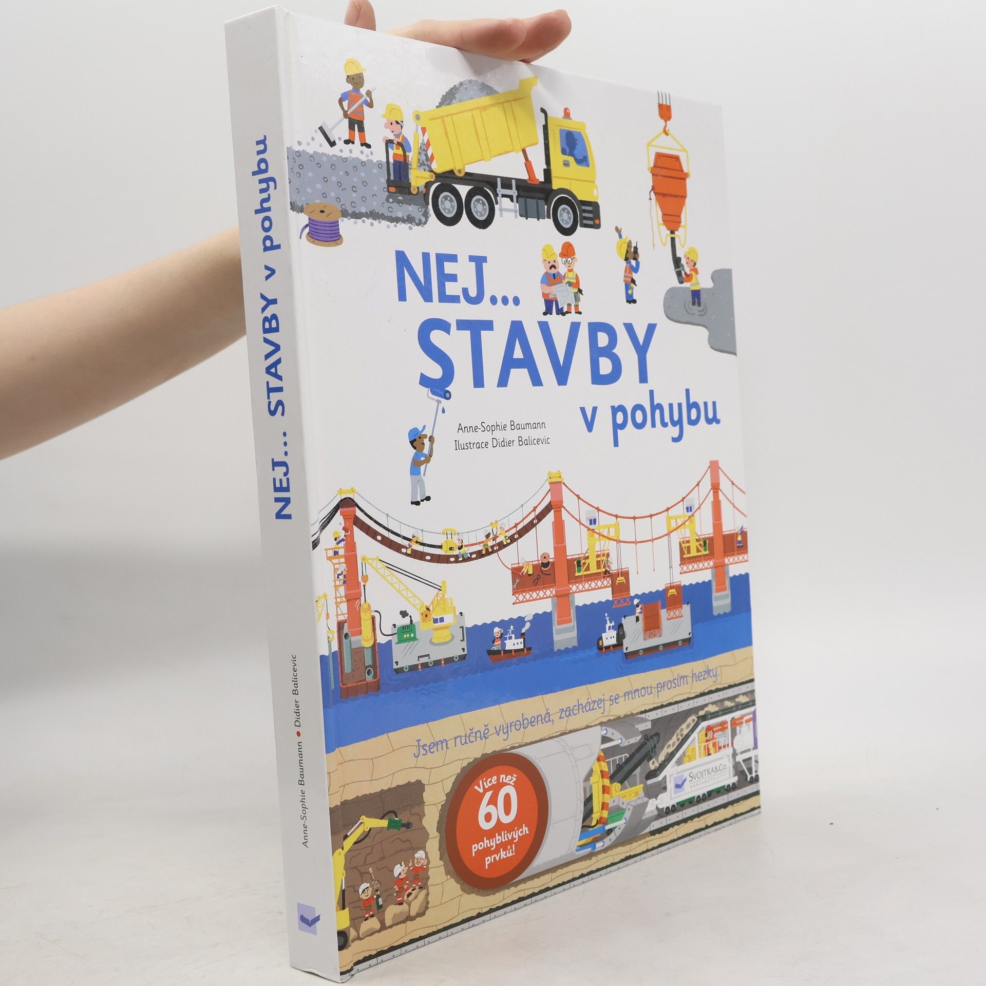 Jak se staví budova? A co taková dálnice? Nebo horská dráha v zábavním parku? Jak sestavit části jeřábu, dopravního letounu či zaoceánské lodi? Víš, jak vztyčit cirkusový stan? Aby mohla odpovědět na všechny tyto otázky, podnikla Anne-Sophie Baumann mnoho reportáží na velkých staveništích a hovořila s odborníky v oblasti stavby domů, mostů, vozovek, loděnic či leteckého a zábavního průmyslu. Ilustrace Didiera Balicevice jsou plné přesných a autentických detailů o těchto velkých staveništích. Více než 60 pohyblivých prvků umožňuje uvést do života stroje a zařízení, které se na velkých staveništích nacházejí: bagry, buldozery, dampry, fixní a mobilní jeřáby, zarovnávací stroje, razicí stroje… Tato kniha ti pomůže pochopit jednotlivé etapy velkých staveb a objevit ohromující dovednosti mužů a žen, kteří na nich tvrdě pracují.