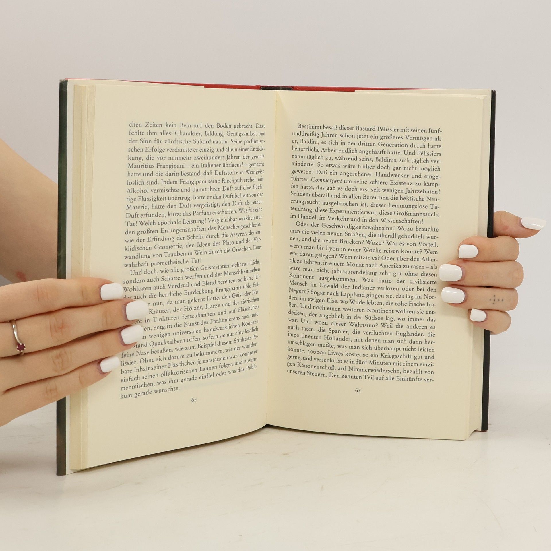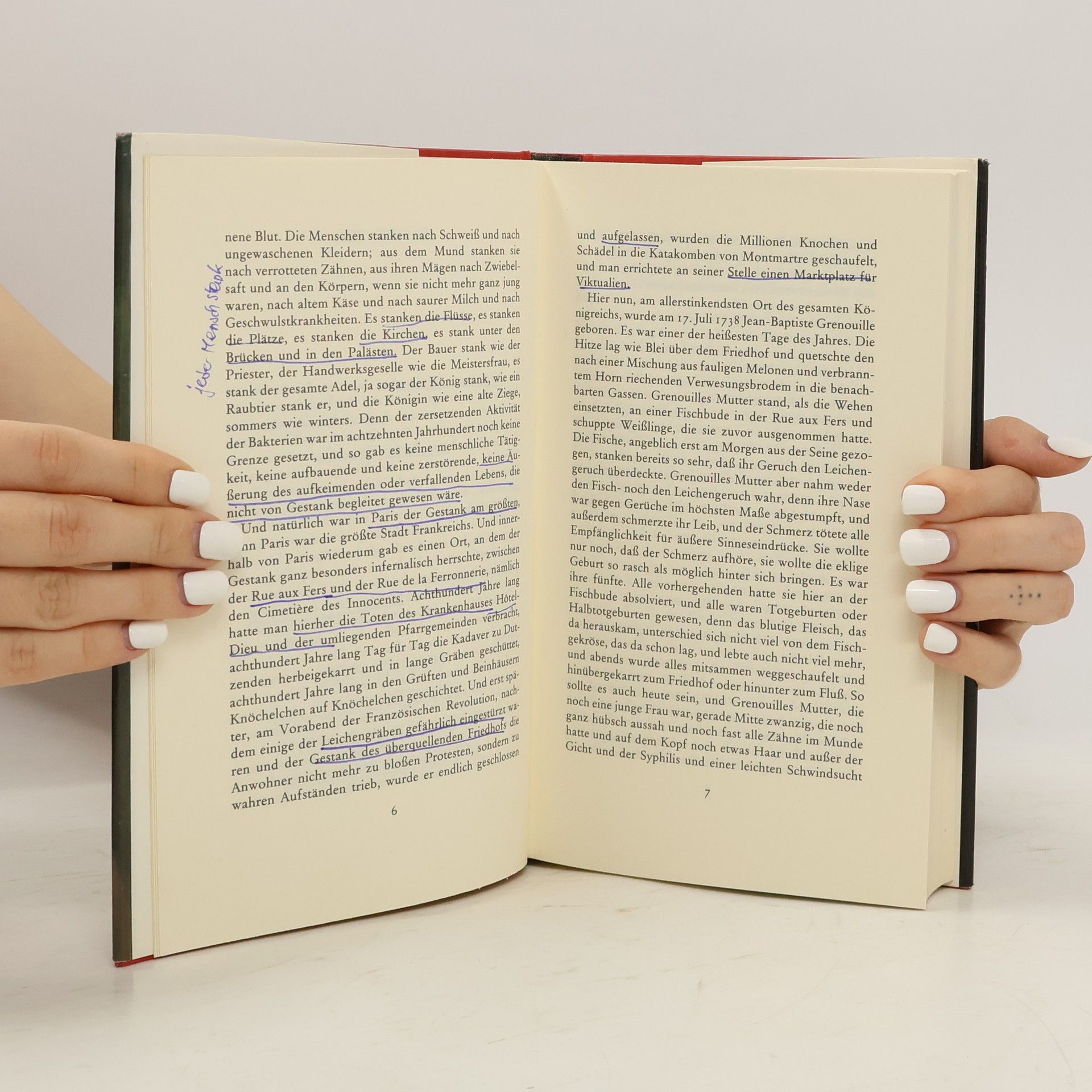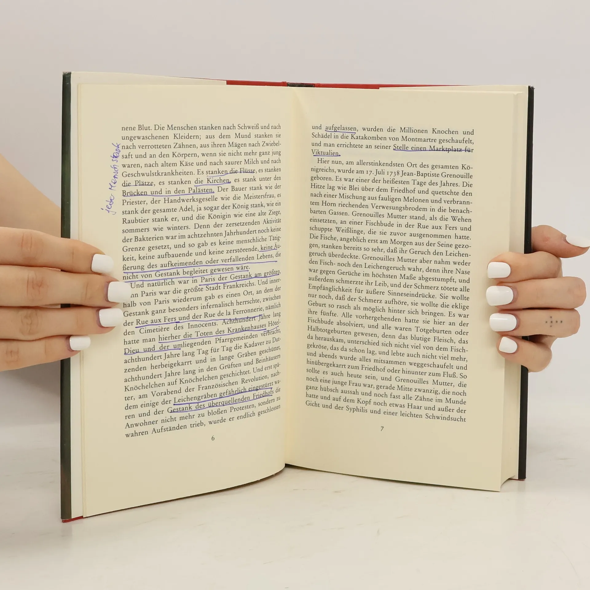 'Von Jean-Baptiste Grenouille, dem finsteren Helden, sei nur verraten, daß er 1738 in Paris, in einer stinkigen Fischbude, geboren wird. Die Ammen, denen das Kerlchen an die Brust gelegt wird, halten es nur ein paar Tage mit ihm aus: Er sei zu gierig, außerdem vom Teufel besessen, wofür es untrügliche Indizien gebe: den fehlenden Duft, den unverwechselbaren Geruch, den Säuglinge auszuströmen pflegen.'