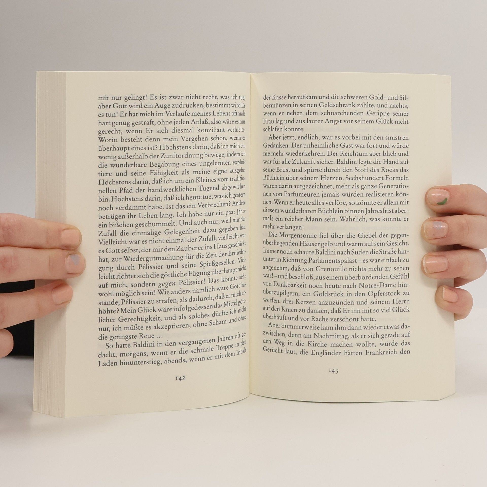 Von Jean-Baptiste Grenouille, dem finsteren Helden, sei nur verraten, daß er 1738 in Paris, in einer stinkigen Fischbude, geboren wird. Die Ammen, denen das Kerlchen an die Brust gelegt wird, halten es nur ein paar Tage mit ihm aus: Er sei zu gierig, außerdem vom Teufel besessen, wofür es untrügliche Indizien gebe: den fehlenden Duft, den unverwechselbaren Geruch, den Säuglinge auszuströmen pflegen.